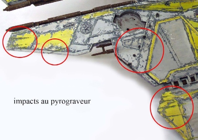 The kit has undergone very few modifications, apart from the interior cockpit. Traces of scratches and gunshot impacts are traced with a pyrograver... A useful tool for working with plastic - and we'll see later that we can also make "trompe l'oeil" markings...