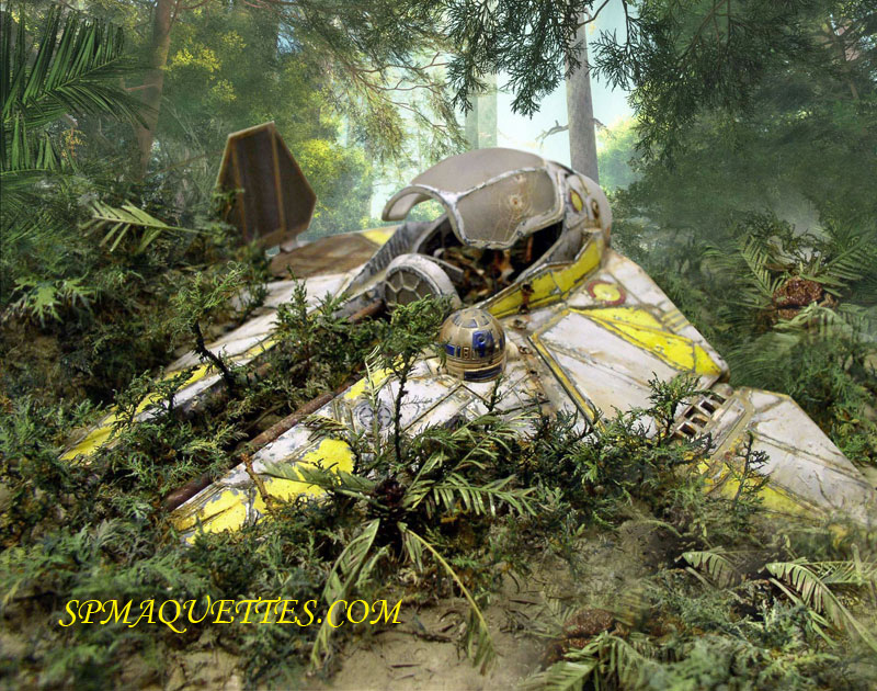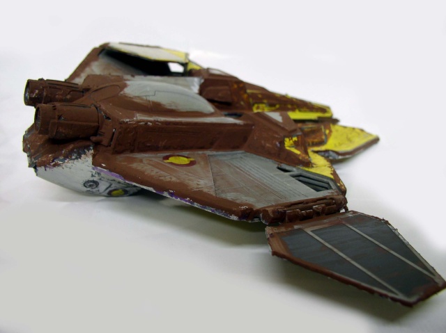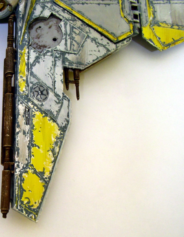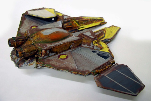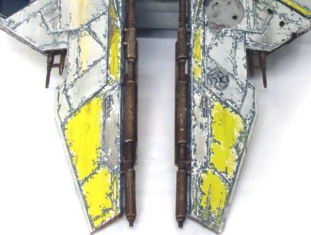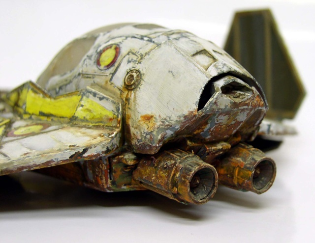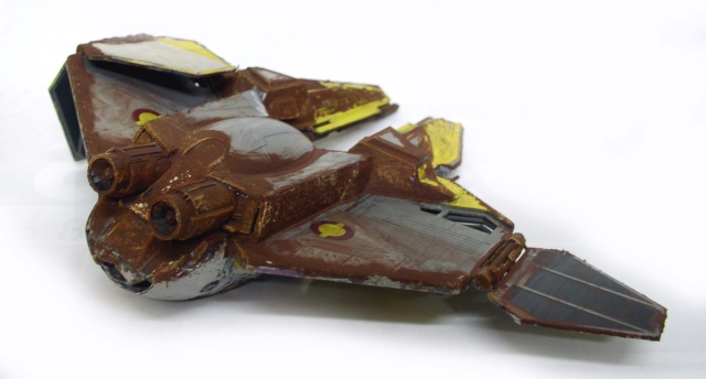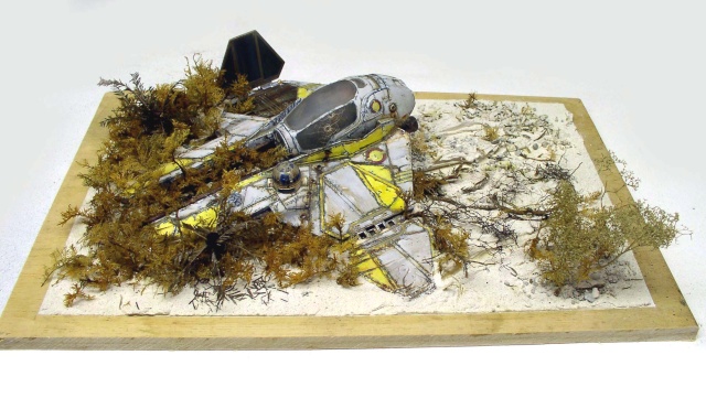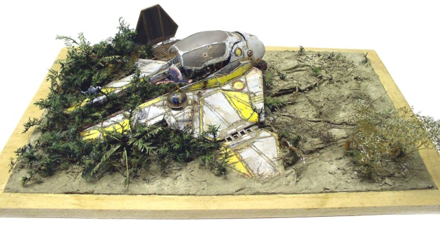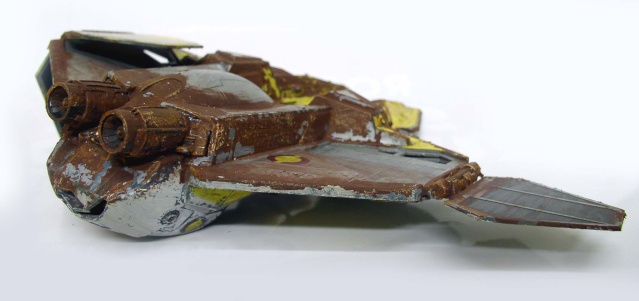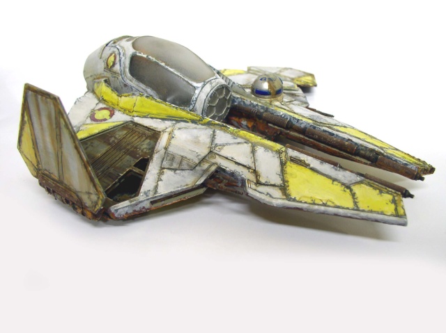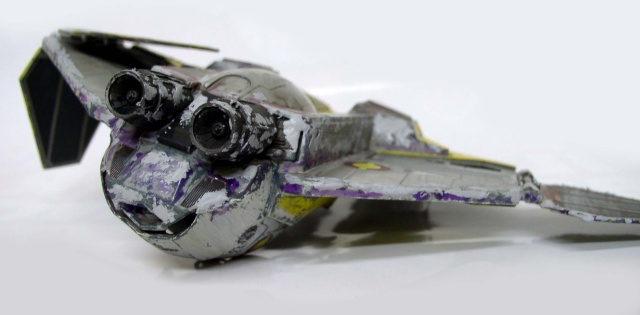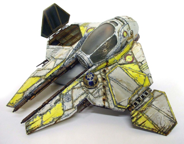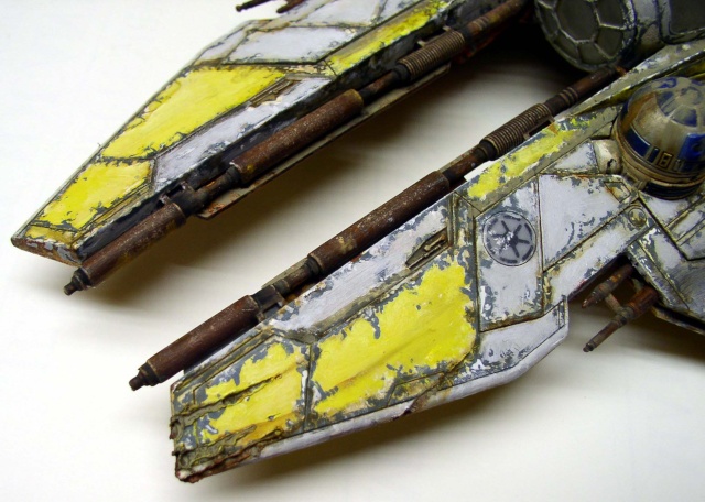 Voici une technique pour vieillir un modèle de vaisseau spatial, le Starfighter d'Anakin - maquette REVELL 1/24ème. La maquette bien finie au départ, est un "easy kit" (kit à encliquer sans colle) prépeint. Comme le but était dans faire une épave, elle n'a pas été repeinte. Sinon la base est la même que pour peindre un char...