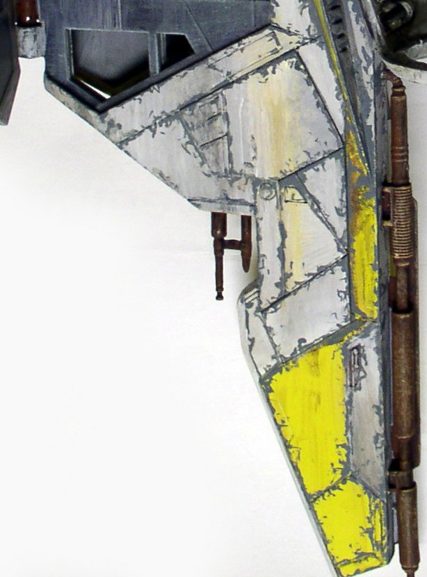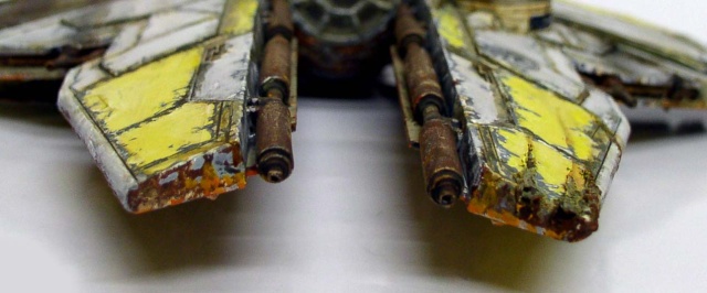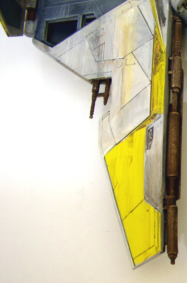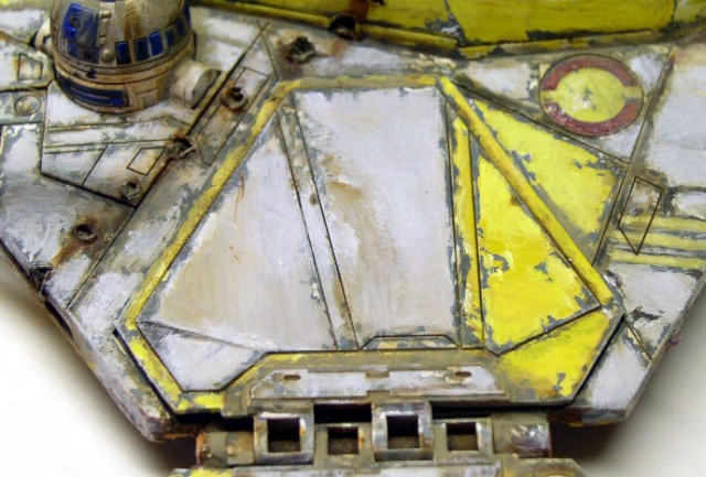 Here's a technique for aging a spaceship model, Anakin's Starfighter - REVELL 1/24 scale model. The initially well-finished model is a pre-painted "easy kit". As the aim was to make a wreck, it hasn't been repainted. Otherwise, the basis is the same as for painting a tank...