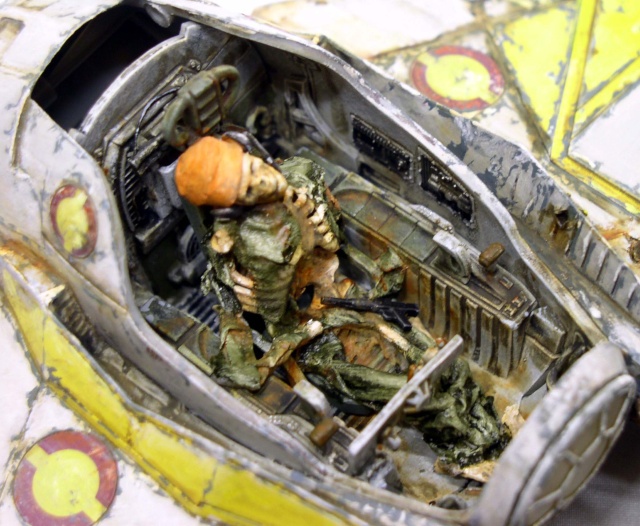 L'intérieur de l'habitacle est redétaillé.Le pilote en caoutchouc du kit est prestement évacué et remplacé par... un squelette dont les restes de vêtement sont réalisés avec un bout de mouchoir en papier dilué dans de la colle à bois...