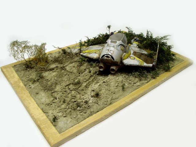 Le chasseur est sensé s'être écrasé en forêt après un atterrissage forcé suite à une attaque. La base sera un panneau de contreplaqué pas trop grand mais qui laisse de l'aération pour le modèle. On laisse une bordure de 2 à 3 cm autour de la plaque que l'on protège avec du scotch de carrossier. Ensuite une couche d'enduit blanc acrylique (Gesso) viendra l'imperméabiliser. Le sol est fabriqué à partir de MODELING PAST de LIQUITEX mais du POLYFILLA ou de l'enduit mural pourront très bien être utilisés et teintés à cette fin. Le séchage lent permet de disposer la végétation, cailloux, racines et divers accessoires tranquillement)...