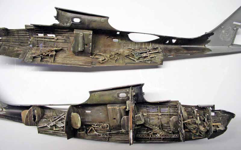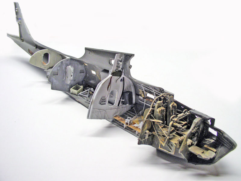 Mise en place des cloisons détaillées, du plancher, du "bazar" sur le plancher (n'oublions pas que c'est une épave), finition des membrures latérales et collage de la cellule de pilotage sans oublier le détaillage du nez...