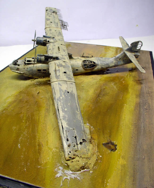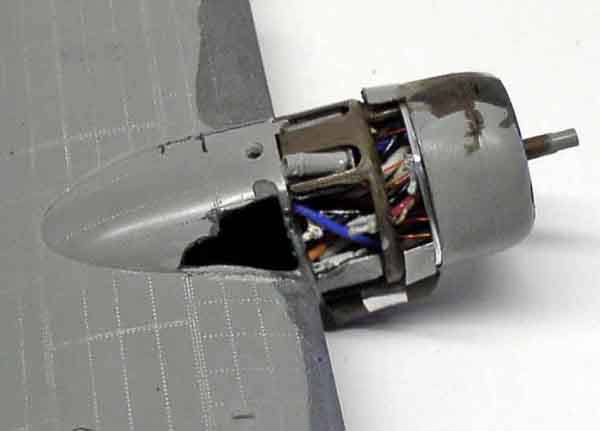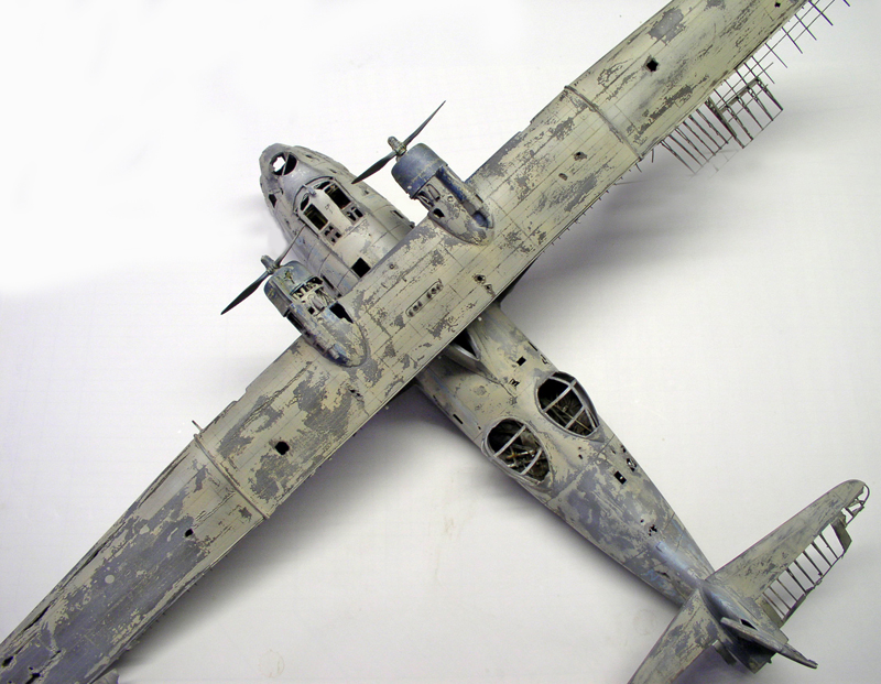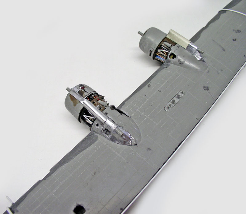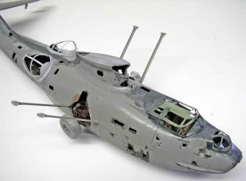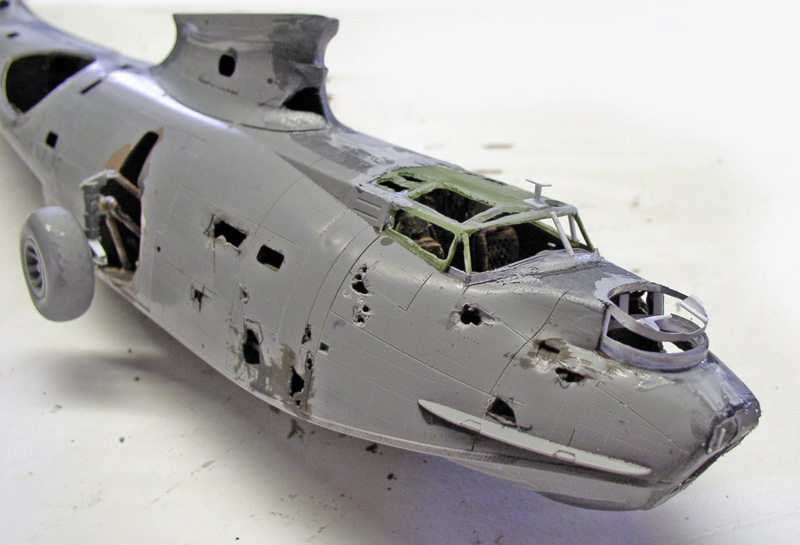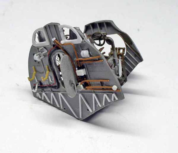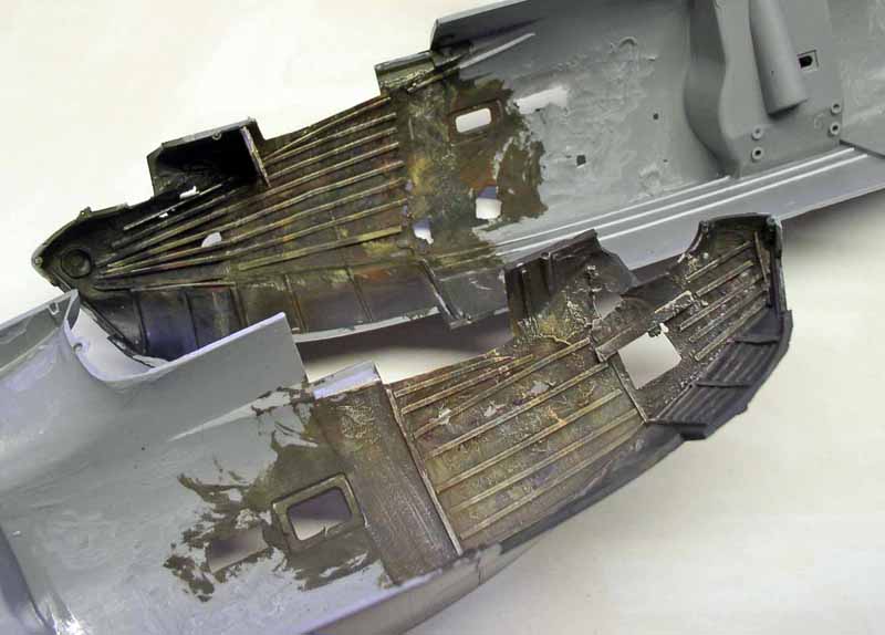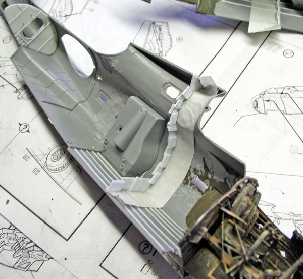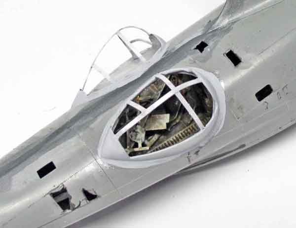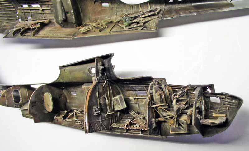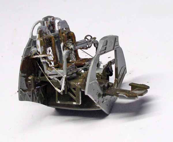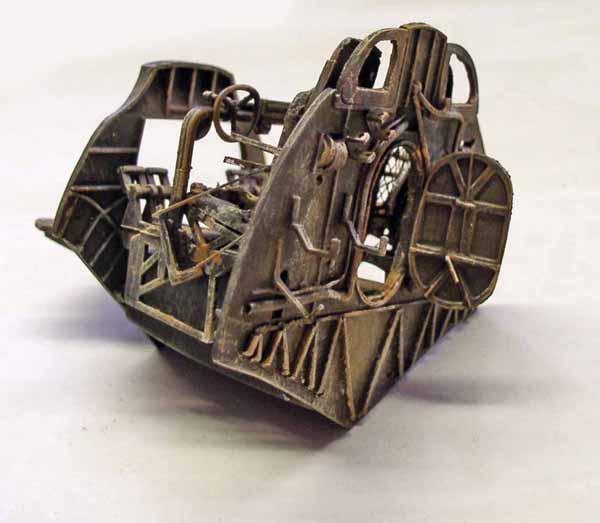 The cockpit area is painted and aged too... Evergreen rod was added before painting. In the upper right and lower left, you can see the grinding strokes used to thin the plastic...