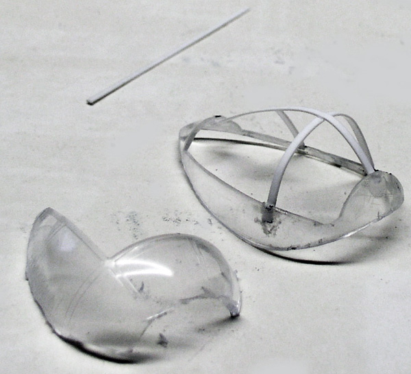 Les ailes ont été découpées longitudinalement et des renforts posés pour éviter un affaissement du plastique. Un fond est collé...