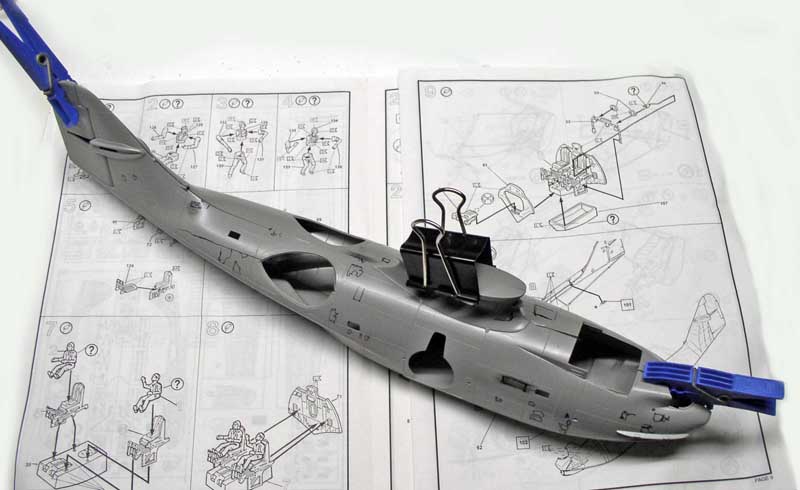 Installation of the detailed bulkheads, the floor, the "mess" on the floor (let's not forget that this is a wreck), finishing the side frames and gluing the cockpit, not forgetting the detailing of the nose...