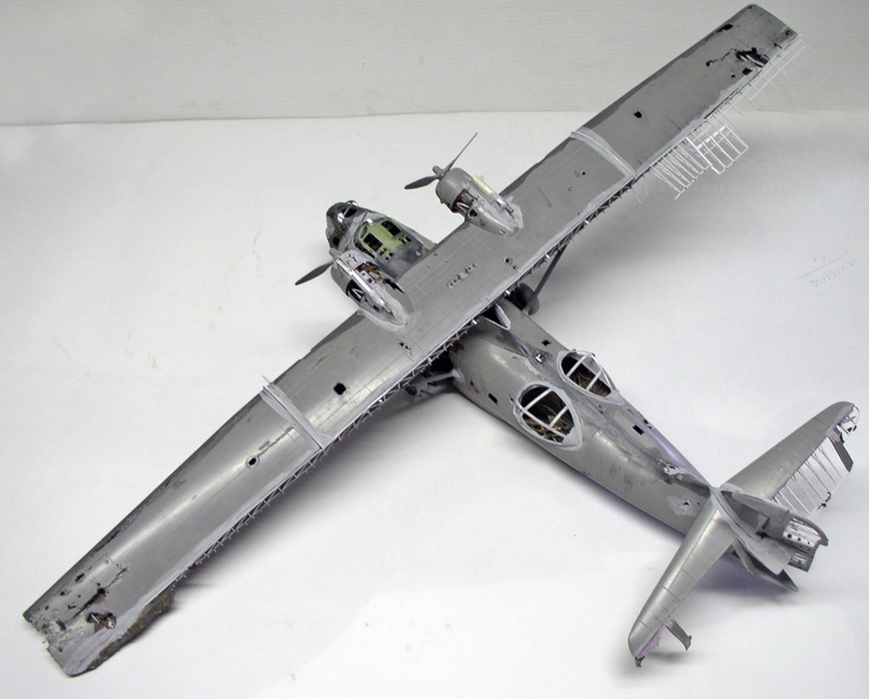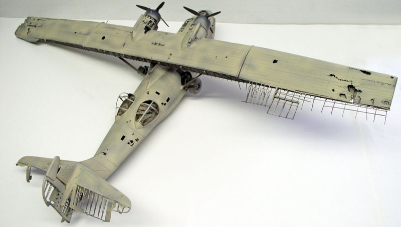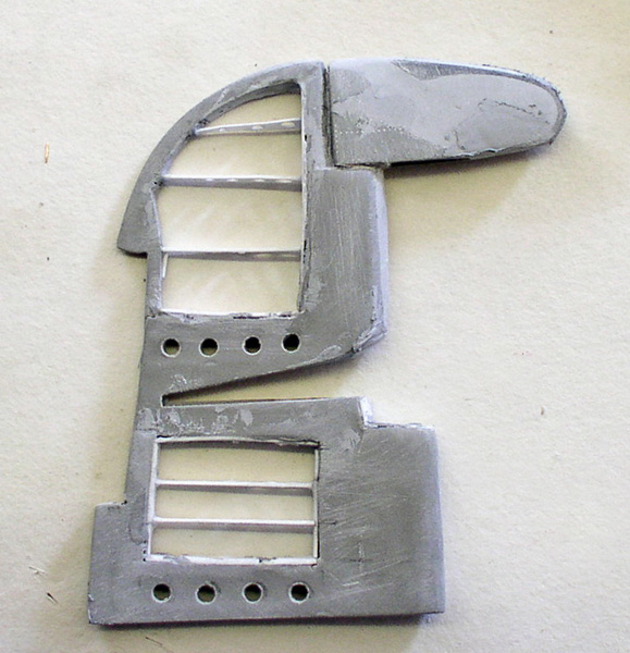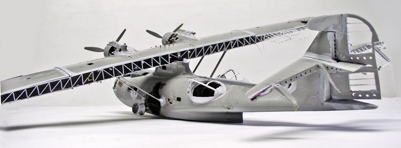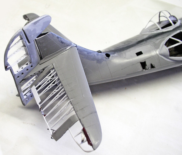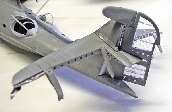 La dérive de queue : est a son tour découpée pour être remplacée par des longerons. La dérive comprend une excroissance arrondie que je n'ai pas trouvé ailleurs (rappelons que c'est un avion démilitarisé et transformé en yacht volant)...