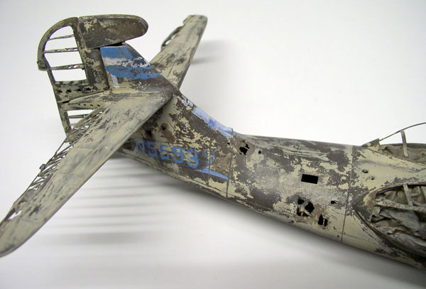 The tail fin is cut away and replaced by spars. The fin includes a rounded protrusion that I have not found elsewhere (remember that this is a demilitarized aircraft transformed into a flying yacht)...