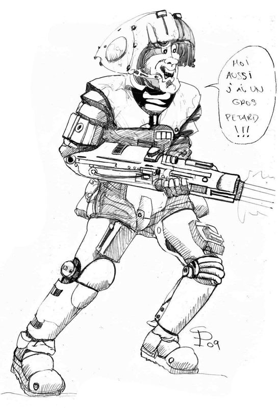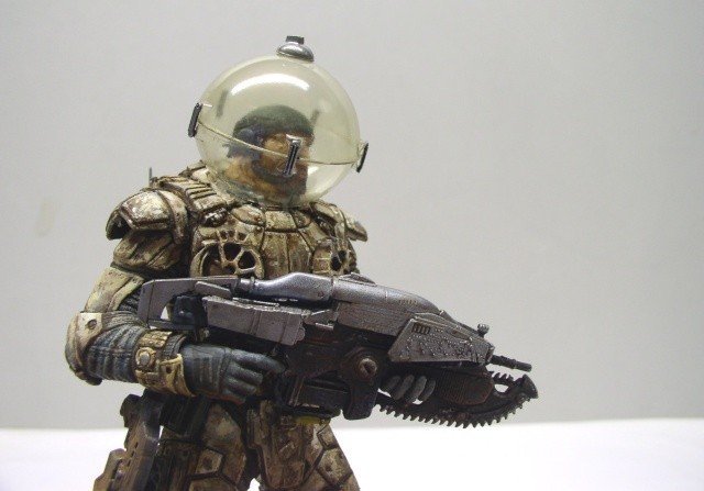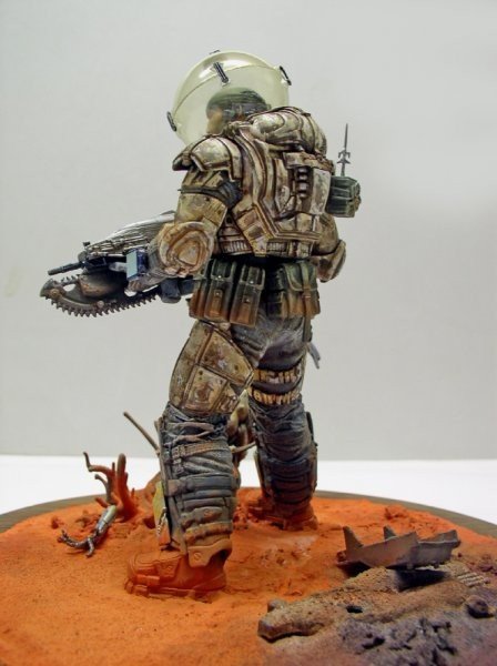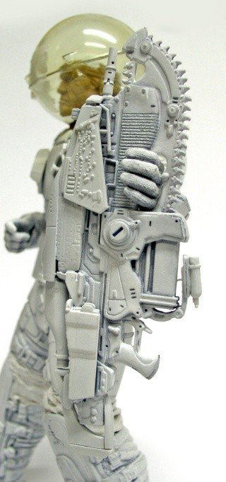 The finished part, helmet in place. The weapon's final color is fixed...more in harmony with the figure and the future environment...