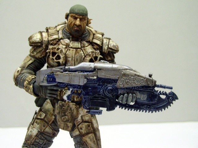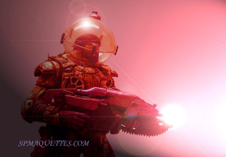 La pièce finie, casque en place. La couleur définitive de l'arme est fixée...Plus en harmonie avec la figurine et le futur environnement...