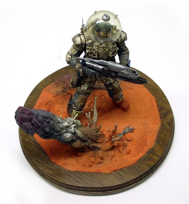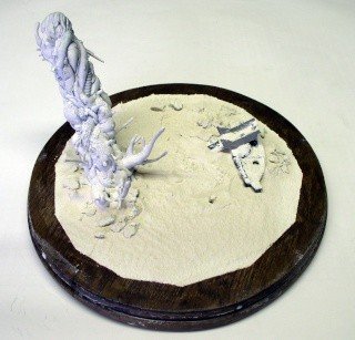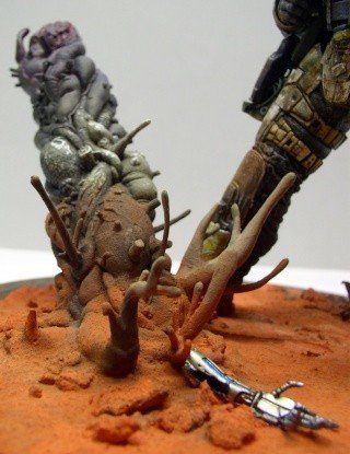 Un gros socle rond mettra en valeur l'imposante figurine... Un arbre extraterrestre et des débris métalliques complèteront l'ensemble...