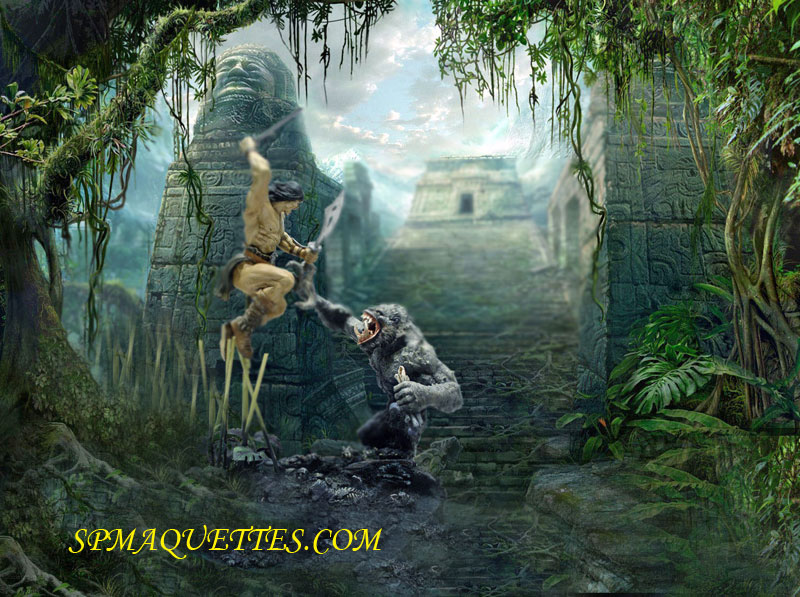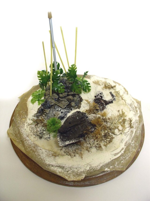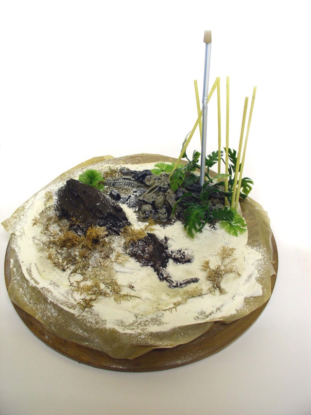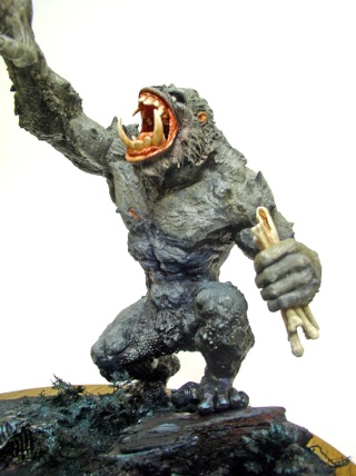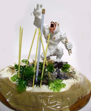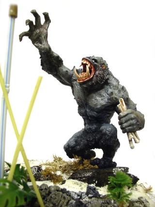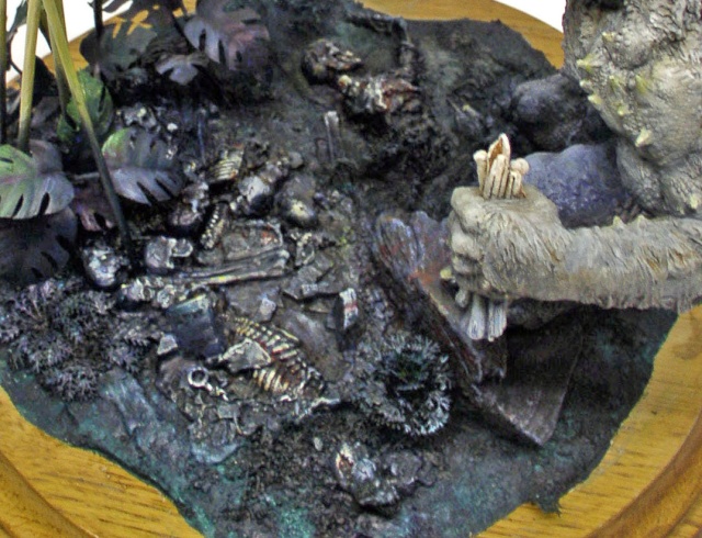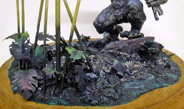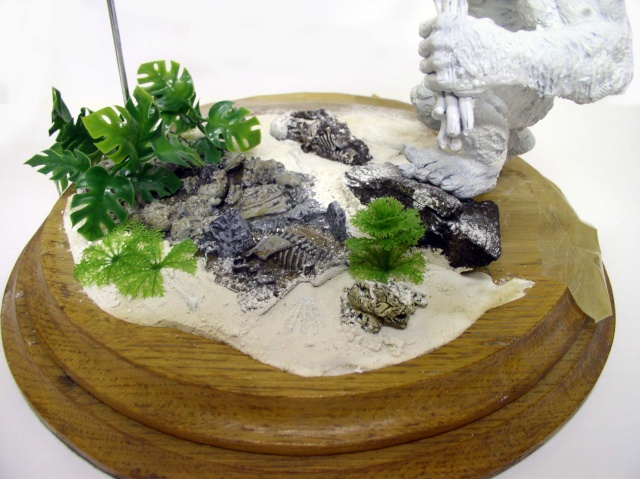 Un socle rond et lourd se devait de soutenir le tout. La base représente l'entrée de la caverne du singe d'où, les ossements sur le sol. Le décor est prêt pour la peinture...