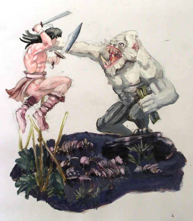 La scène de Conan se jetant sur un singe mangeur d'hommes devait être éclairée de haut en bas. J'ai fait une gouache rapide sur le papier pour me faire une idée. Le plus éclairé étant Conan, puis le haut du singe, puis on passe à la pénombre. Le singe était prévu blanc au départ, je décidais de le faire gris comme à l'origine, plus conforme à la jungle...