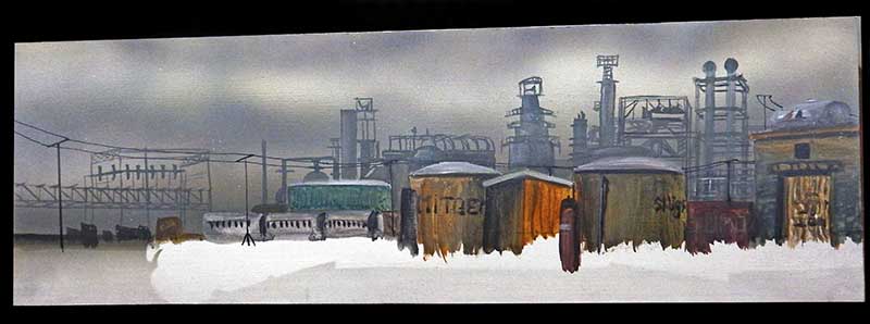 Un coin de hangar est installé ainsi que des barrières de quai. On colle les rails après avoir saupoudré le sol de poudre fine. On dessine au cutter du dallage sur le sol. Celui-ci est martelé avec une brosse métallique et avec le pouce pour créer de légères déformations du sol et de petits trous propres au béton...