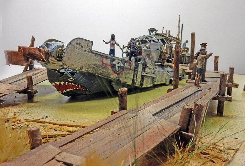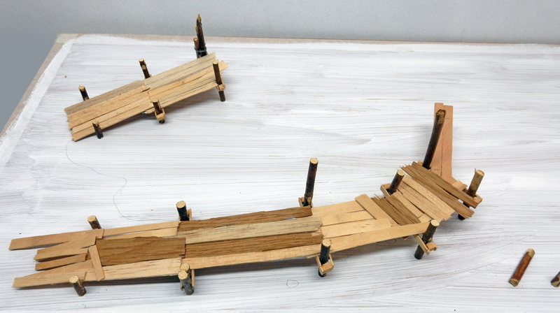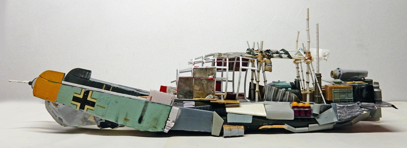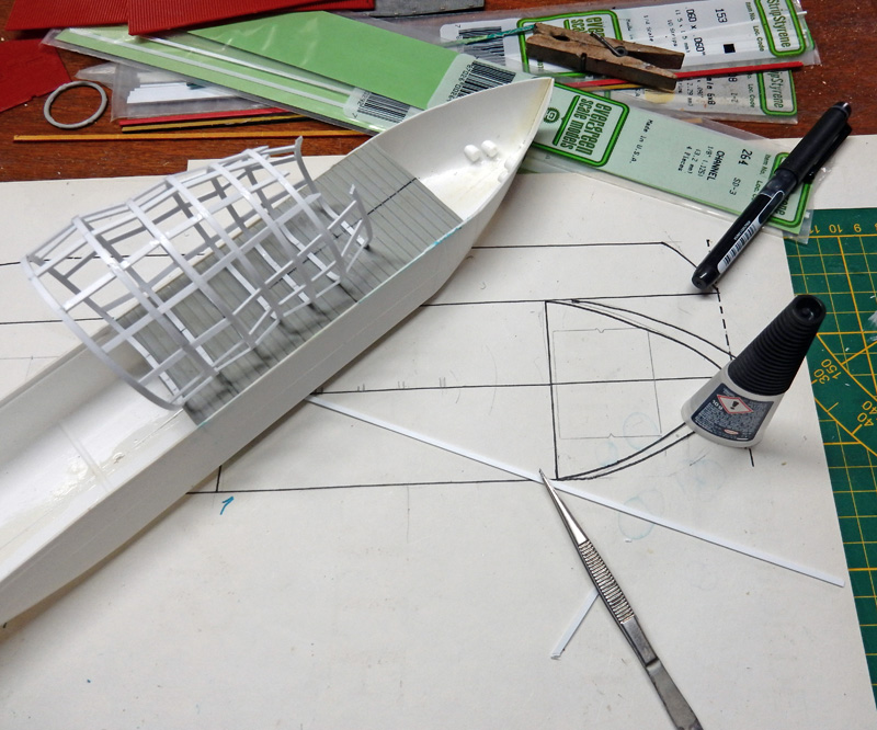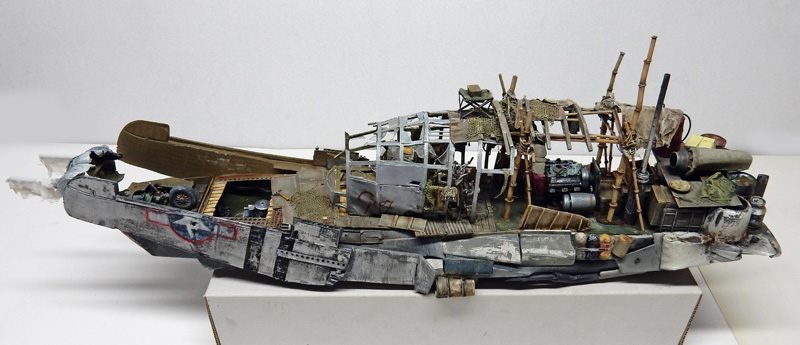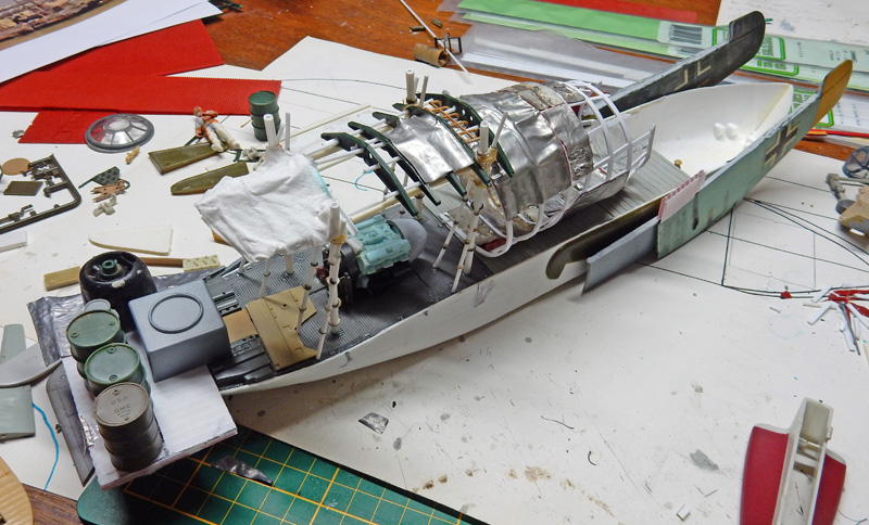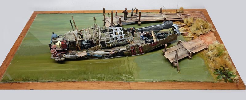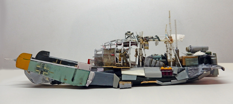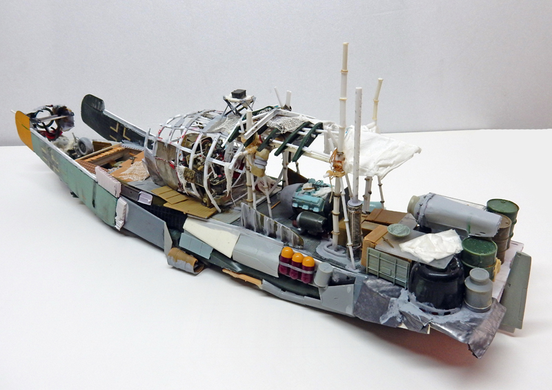 La maquette n'existant pas, il faut se rapprocher des photos pour la construction. Une coque de bateau servira de base de ce navire qui fait plus penser à un radeau qu'à un bateau...