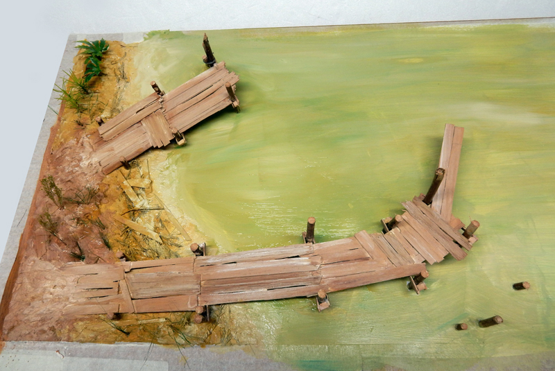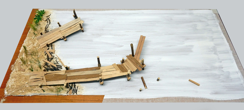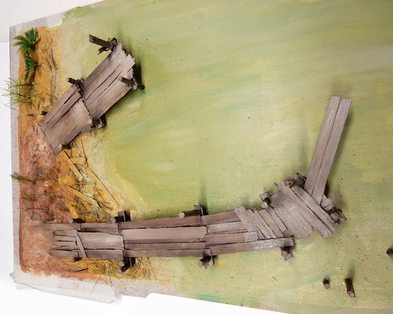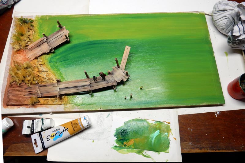 Le décor, une plaque de contreplaqué de 80cm sur 60cm sur lequel on va créer une berge et des pontons...