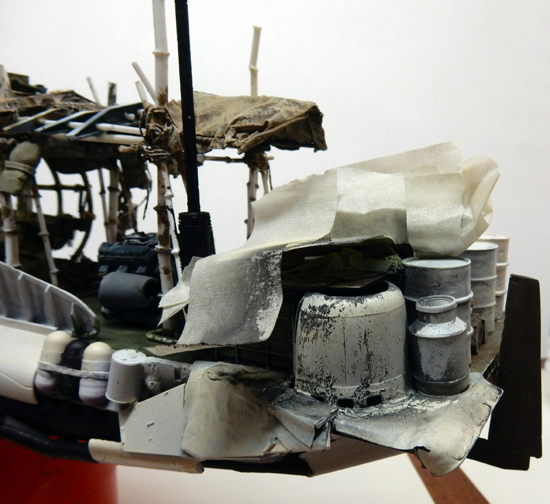 Le pont, la cale, les bâches et parties bois sont peints avec diverses couleurs à l'huile Humbrol. Des verts armée, beige, marron, tous "drybrushés" avec des couleurs plus claires en final...
