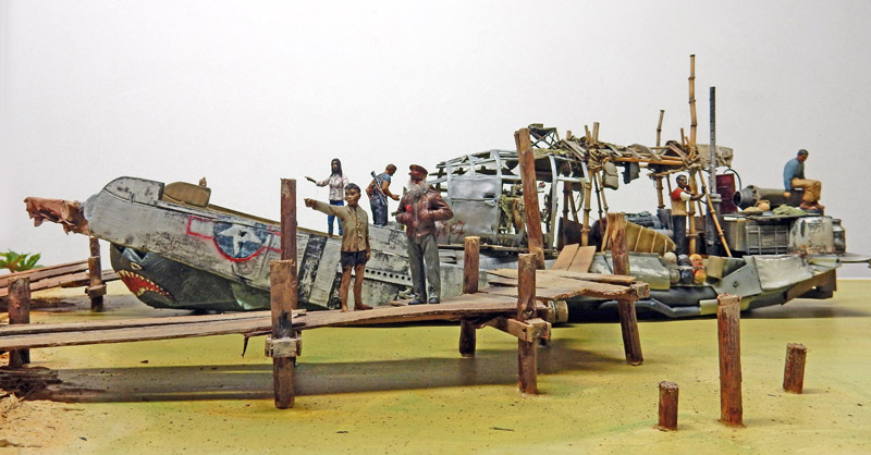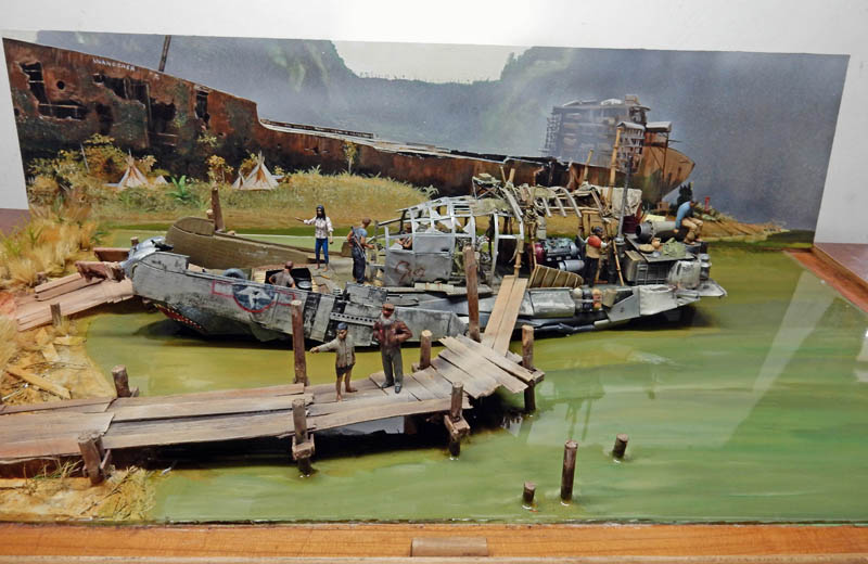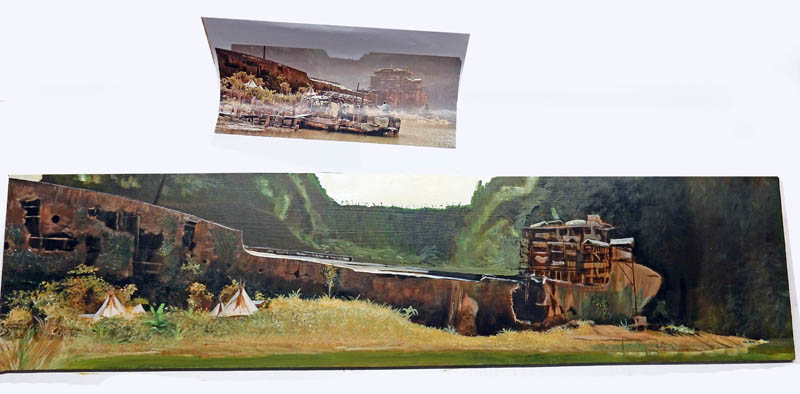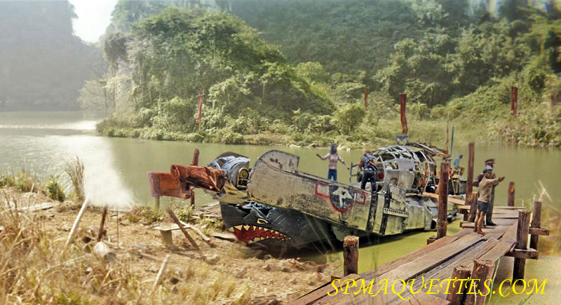 Skull Island : un film d'aventures de 2017 qui raconte les péripéties d'explorateurs en 1973 - accompagnés de militaires - partis découvrir une île inconnue du Pacifique où règne un singe géant. Un remake de plus de King Kong... Un film à voir comme une bd d'aventure. Bref le bateau des héros est une occasion de créer un diorama inédit...