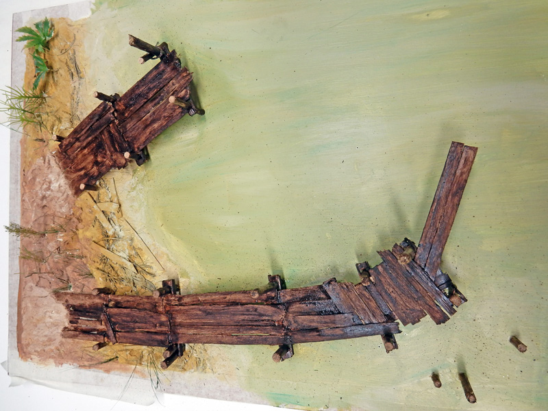 La berge est installée - colle à carrelage et quelques plantes séchées et en plastique sont fixées...