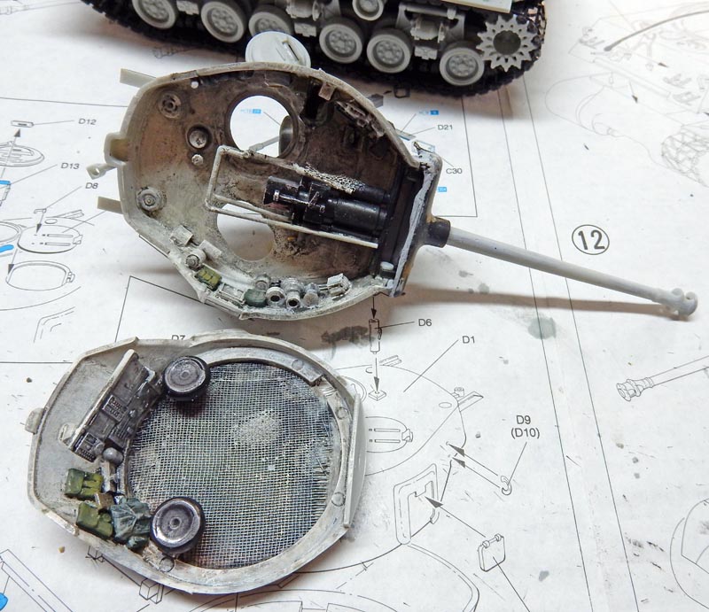 On créait donc un plancher au ras de la tourelle (on aurait pu aussi ôter le plancher), puis une culasse complète et des accessoires à l'intérieur dont les sièges. Le tout est peint et vieilli avant fermeture...