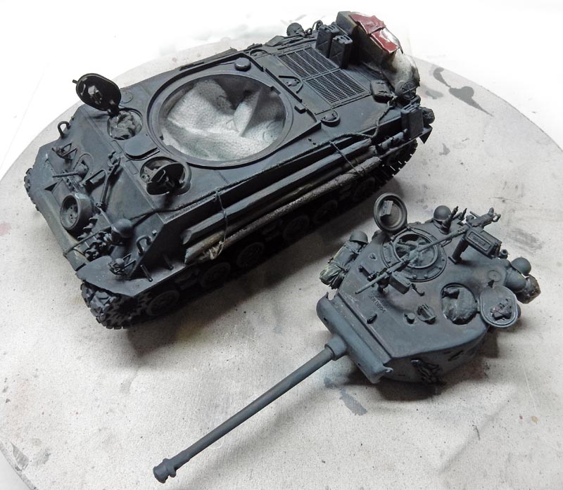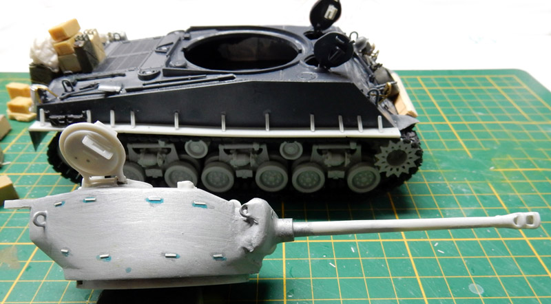 Les deux parties de la tourelle sont collées et il faut bien veiller à mastiquer le joint tout autour puis poncer pour le faire disparaître.