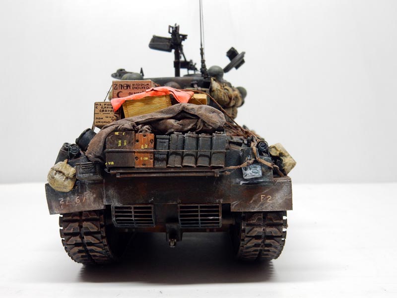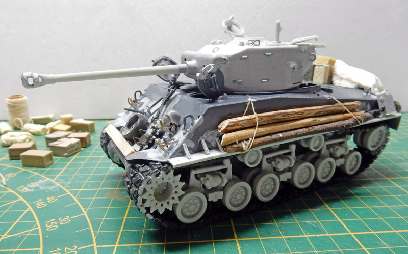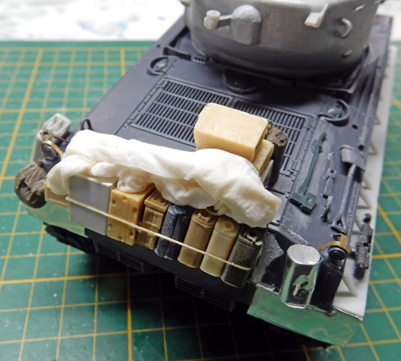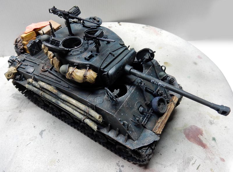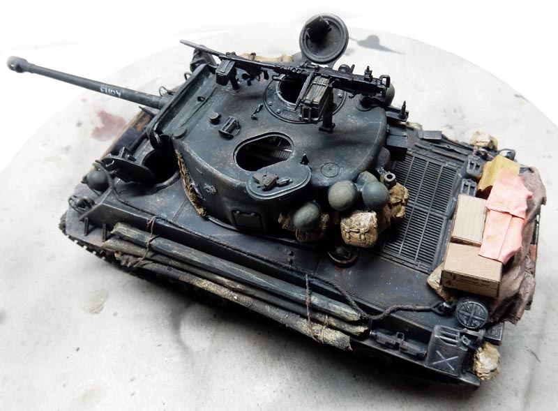 L'ensemble du véhicule a reçu un jus très dilué de terre d'ombre avec un peu de terre de sienne à l'huile. Début de la peinture des paquetages et de la poutre frontales...