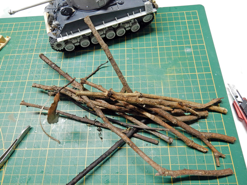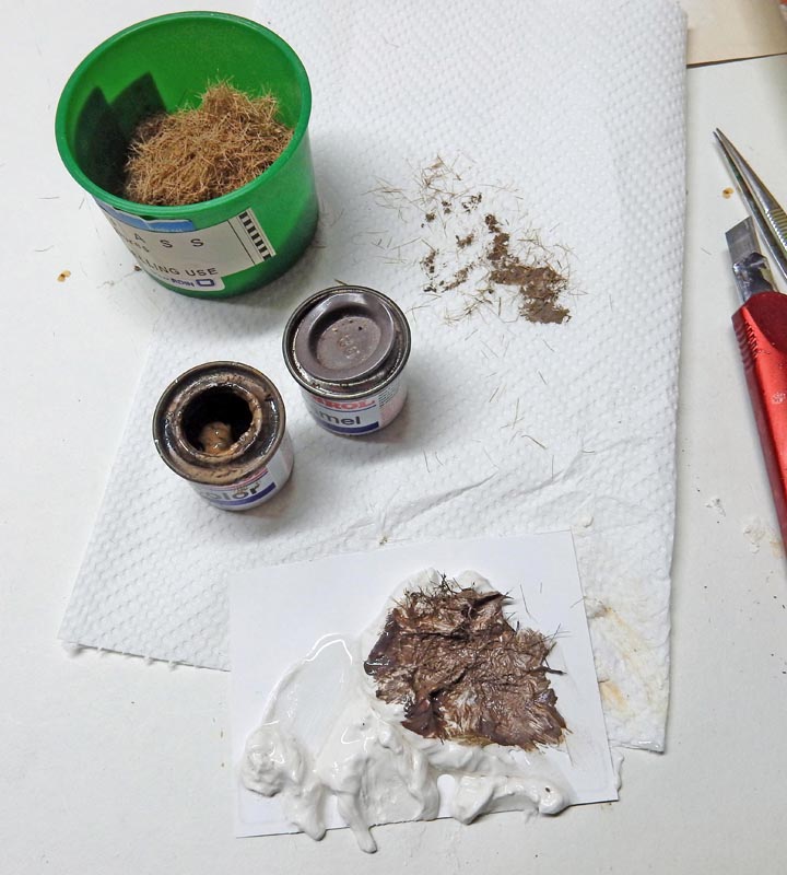 On utilise un marron 29 et un 98 Humbrol et l'on fait une sorte de bouillie que l'on dispose sur le sol et le train de roulement du char (avec légèreté pour le train)...