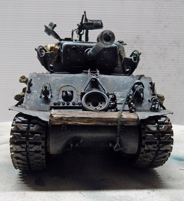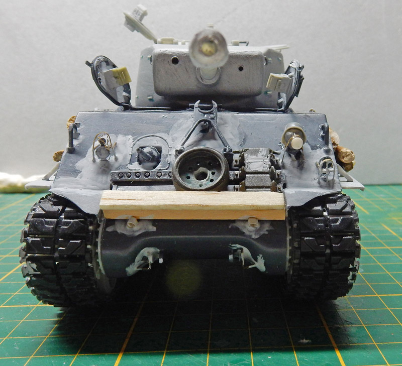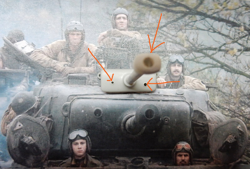 Troisième problème : On passe au masque du canon : par rapport à la photo, les trous de visée ne correspondent pas et le frein de bouche du canon s'apparente plus à celui des panzers qu'au Sherman...