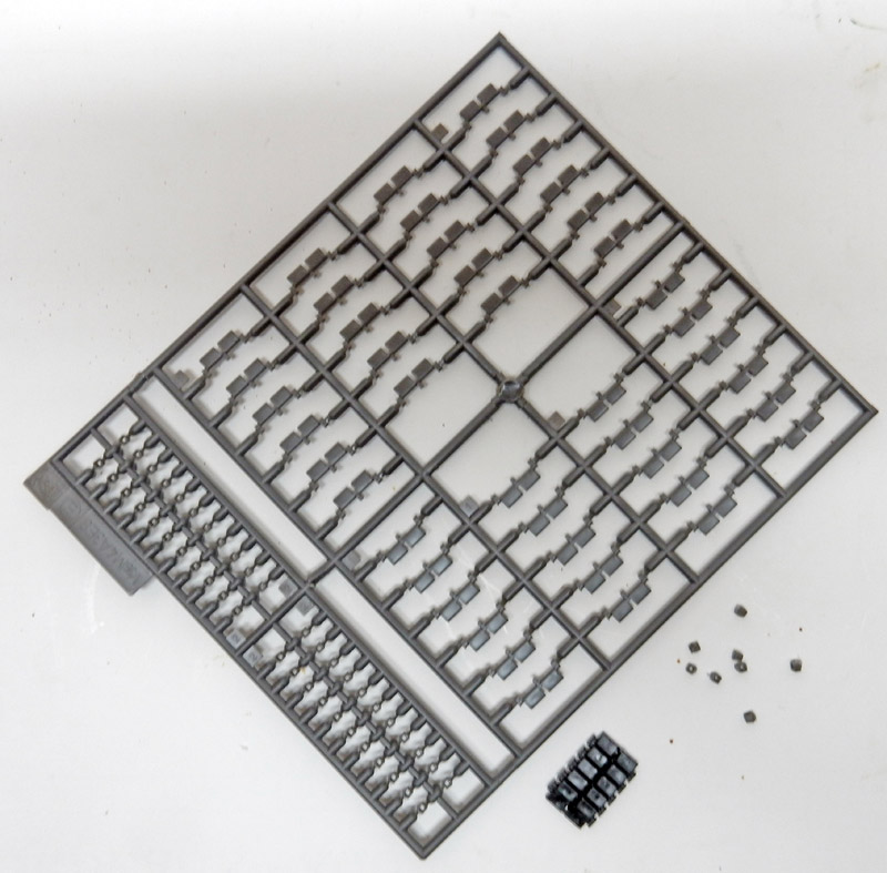 Finalement, l'obstacle est contourné avec un autre jeu de chenilles d'une seule pièce dont les ergots ne correspondant pas sont coupés au cutter et remplacés par ceux de Dragon collés un à un à leur place... Travail de longue haleine sur un plastique mou...