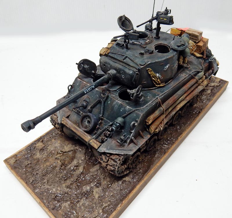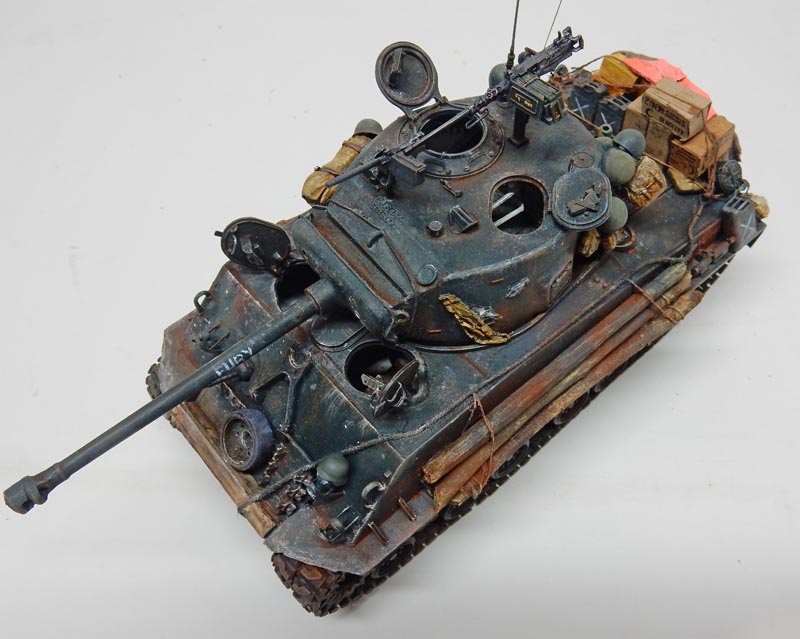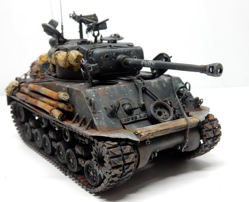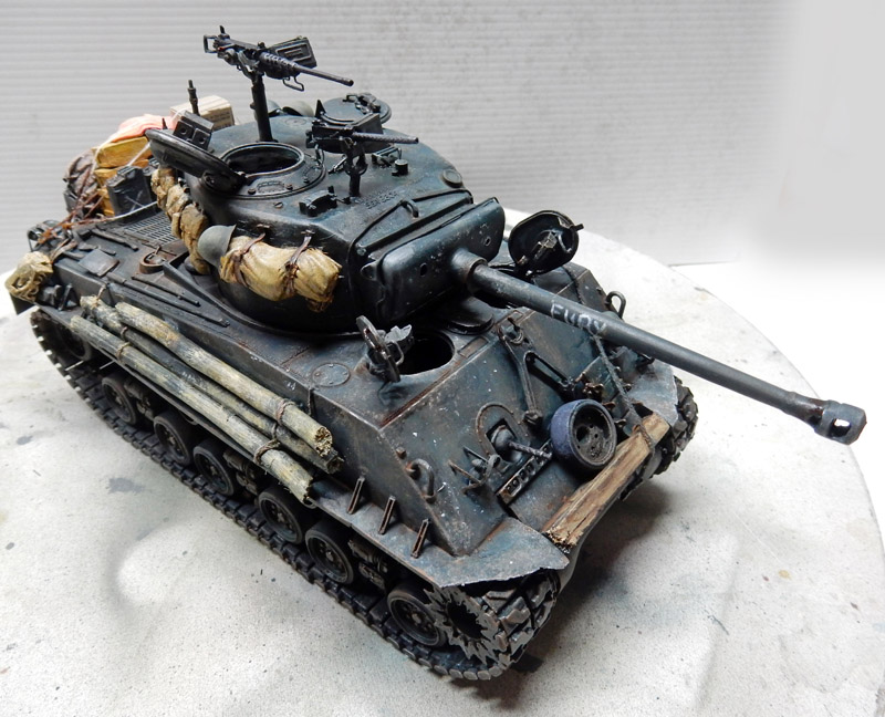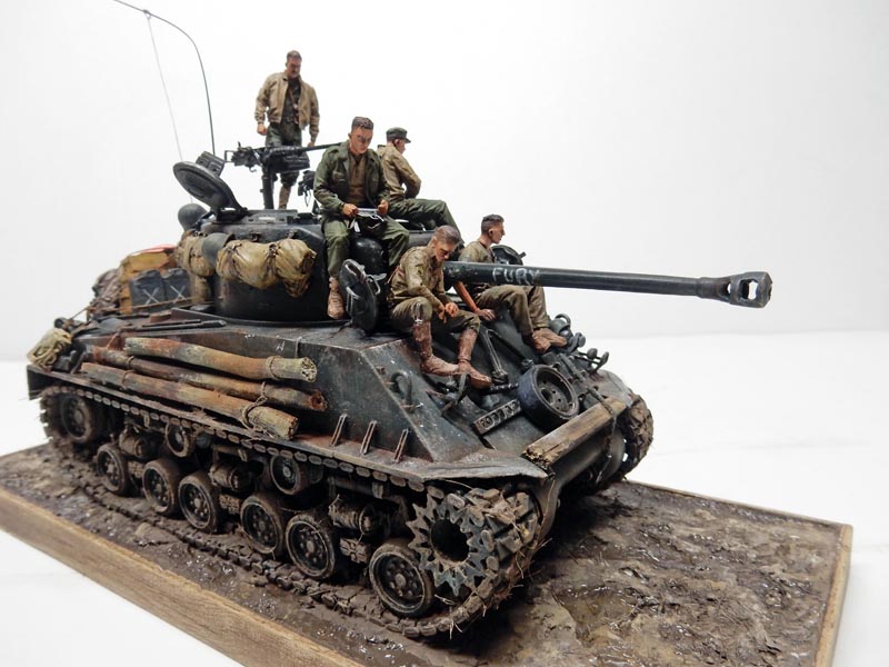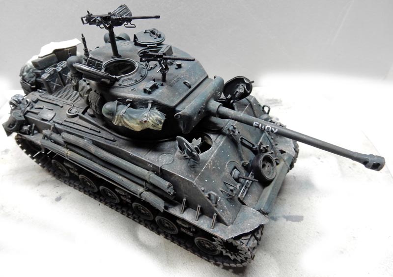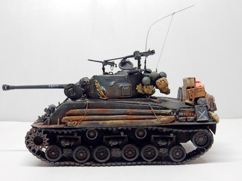 Then a light dry-brush of XF61 is applied. The name "Fury" is painted on the barrel in white. Touches of white simulate the impact of gunfire on the body...