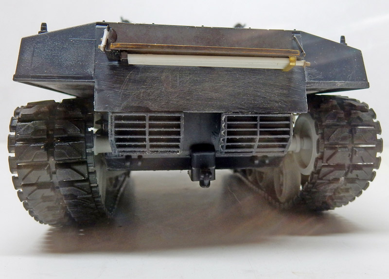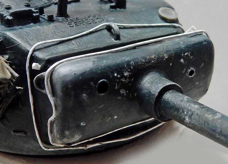 La protection étanche du masque du canon étant absente (curieux non pour un char en campagne ? Mais acceptable pour le cinéma...), des pattes sont ajoutées, le câblage en fil métallique, le tout est collé...