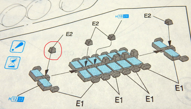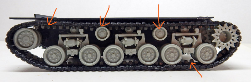 Second problem: the two central track rollers have no markings for fixing to the body (an oversight?!). So, without the track, it's impossible to know exactly how they're centered, and... vice versa!