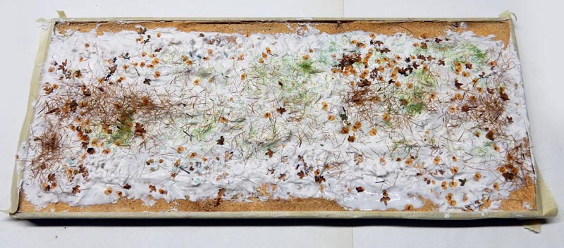 Il est enduit de colle à carrelage diluée dont on dépose divers flocages puis on fait l'empreinte des chenilles...