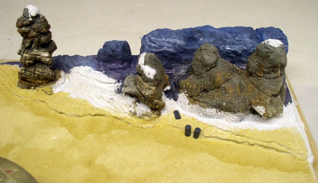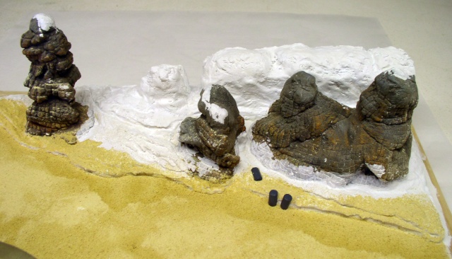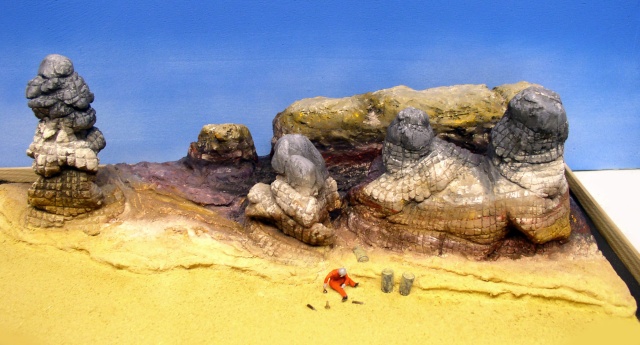 Les falaises et pics sont sculptés en plâtre de Paris sur armature métallique et polystyrène extrudé...