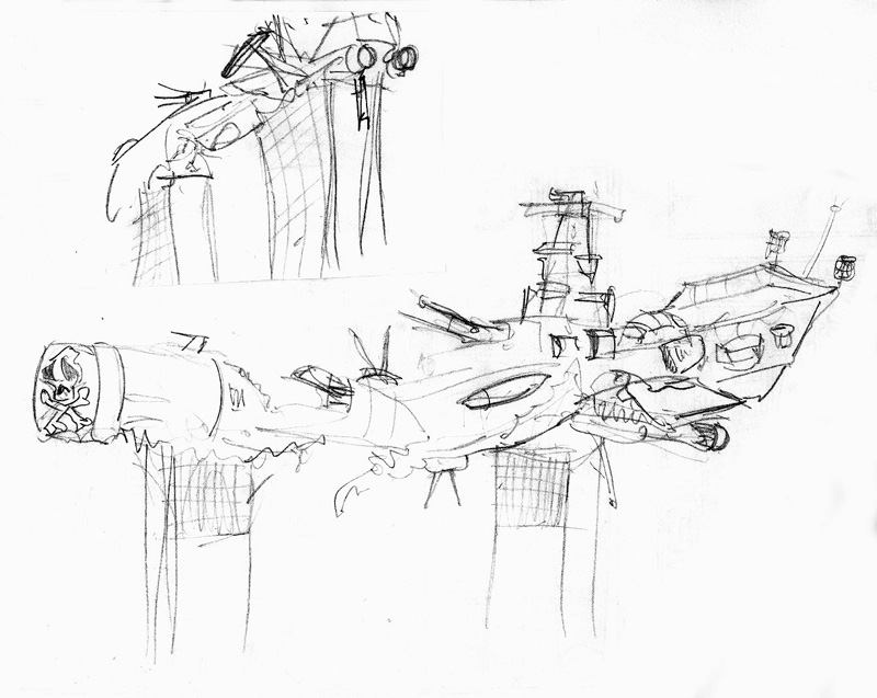 The ship, returning from piracy, didn't have time to land. The ship was "crashed" on two towers (???), so drawings were needed to visualize the whole...