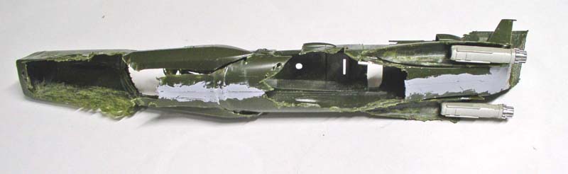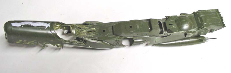 Puis le tiers avant - au niveau des renflements - est découpé à la scie pour donner un effet de cassure et relever cette partie par rapport au reste du vaisseau. Après masticage et ponçage des joints visibles, toutes les tôles arrachées et les sections ouvertes endommagées sont meulées pour affiner le plus possible le métal et le déformer (n'oublions pas que l'échelle est le 1/1000ème. Les réacteurs de la proue - se limitant à deux embouts - sont remplacés par d'autres pris dans la boîte à surplus. Ceux-ci doivent être bien visibles, leurs carénages ayant disparu dans le choc...