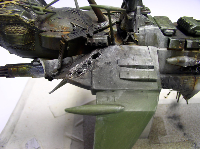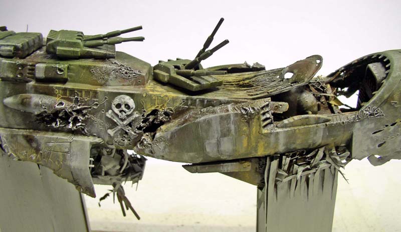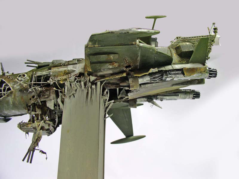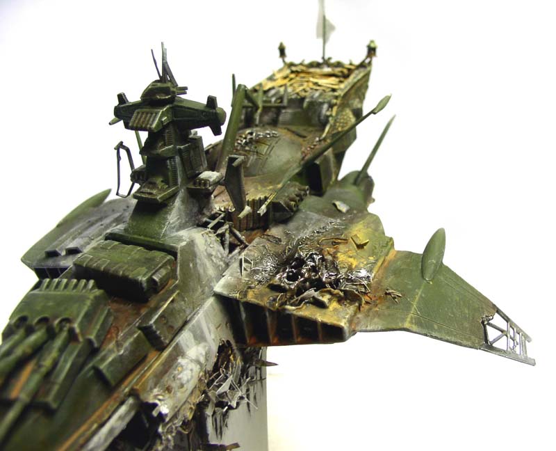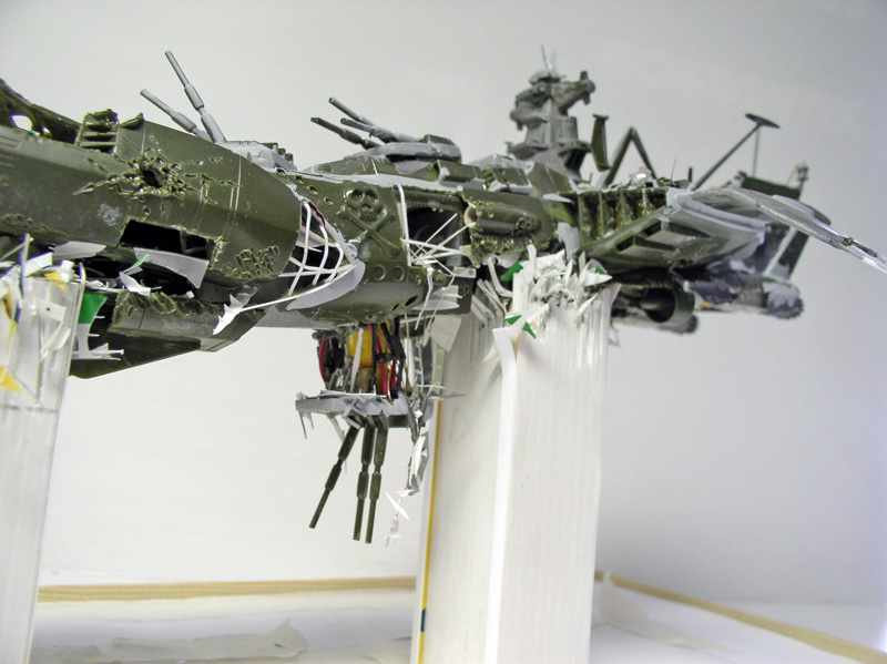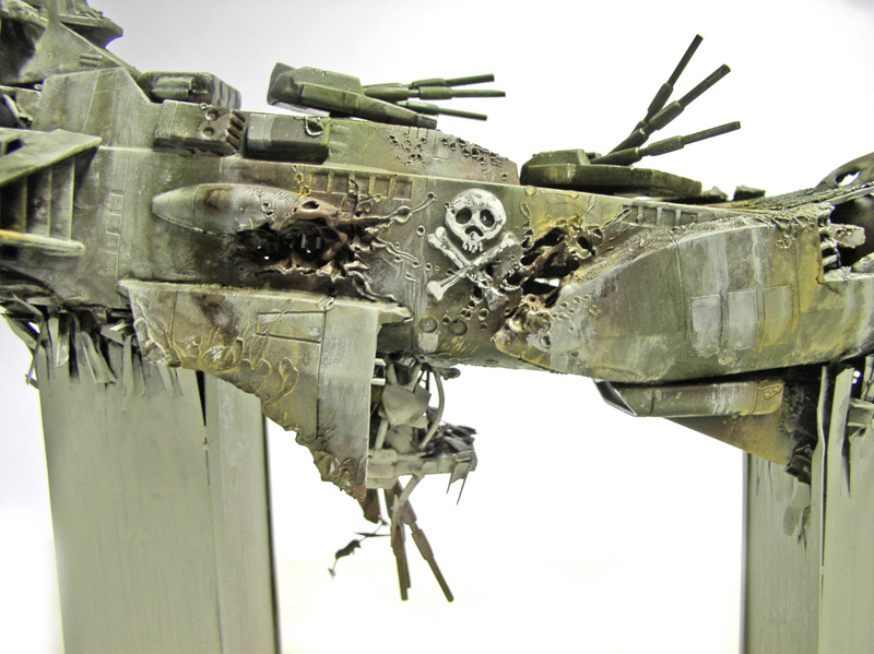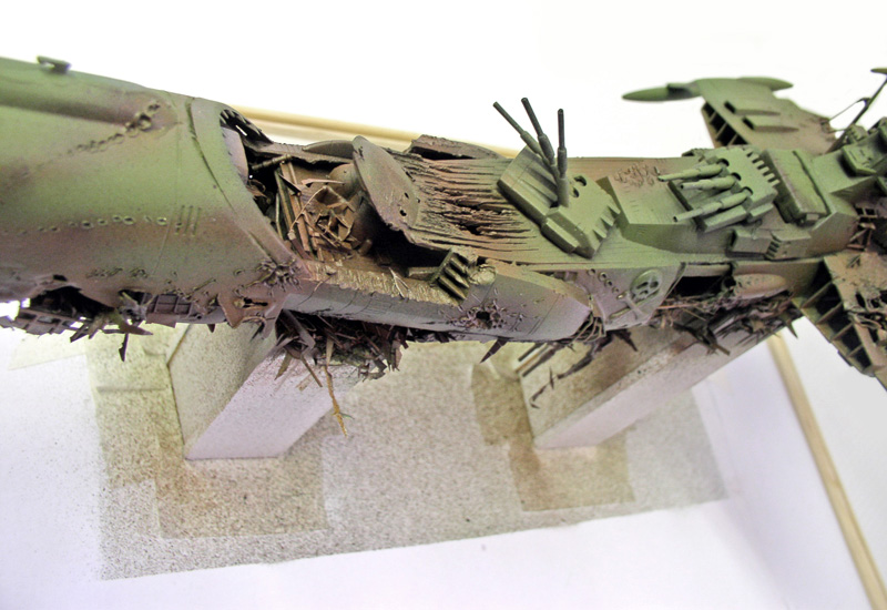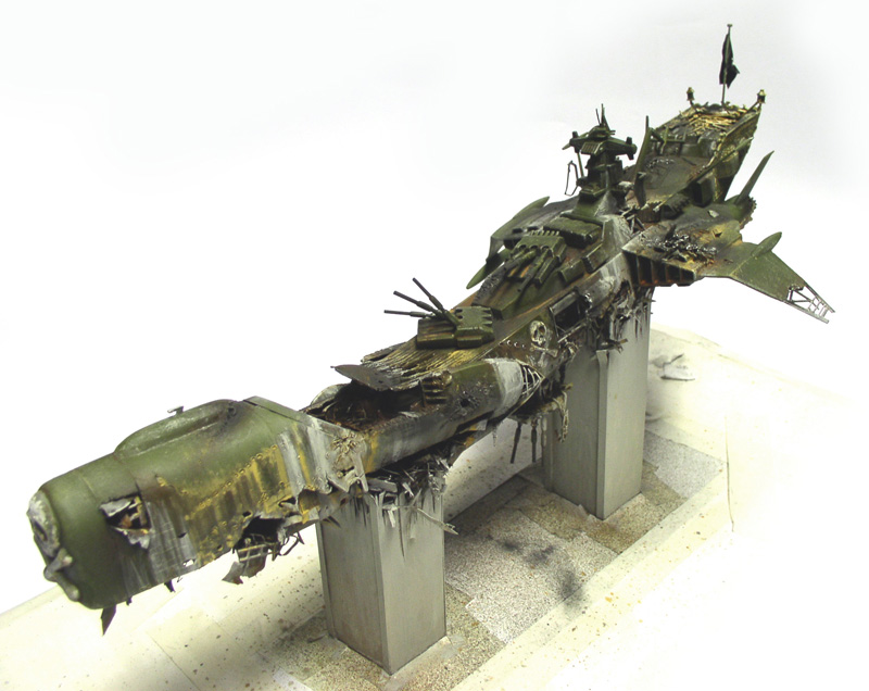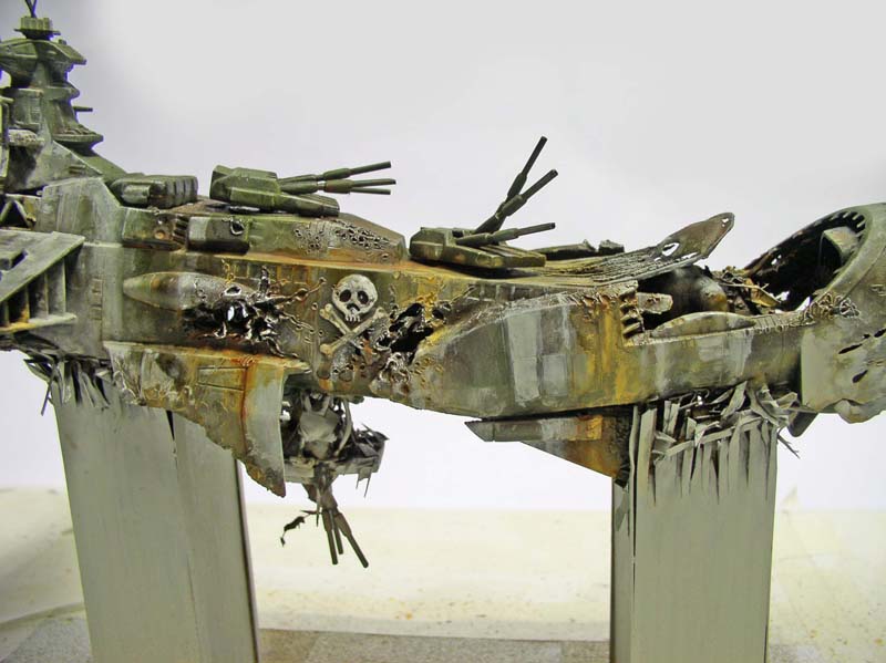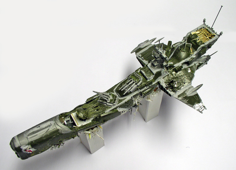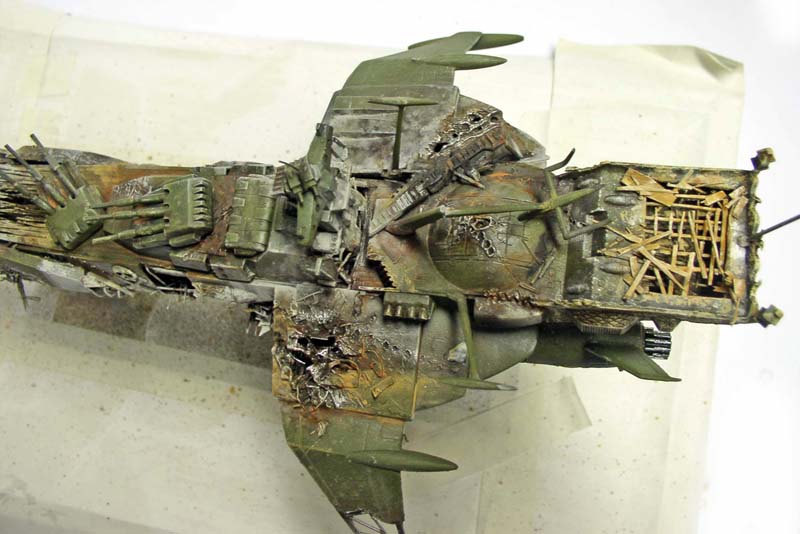 View of the positioned model... The impacts of laser fire and various explosions on the hull are made with a pyrograver (they are best seen in the photos showing the painting stages...