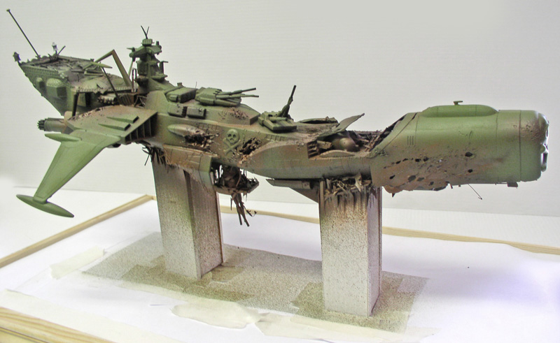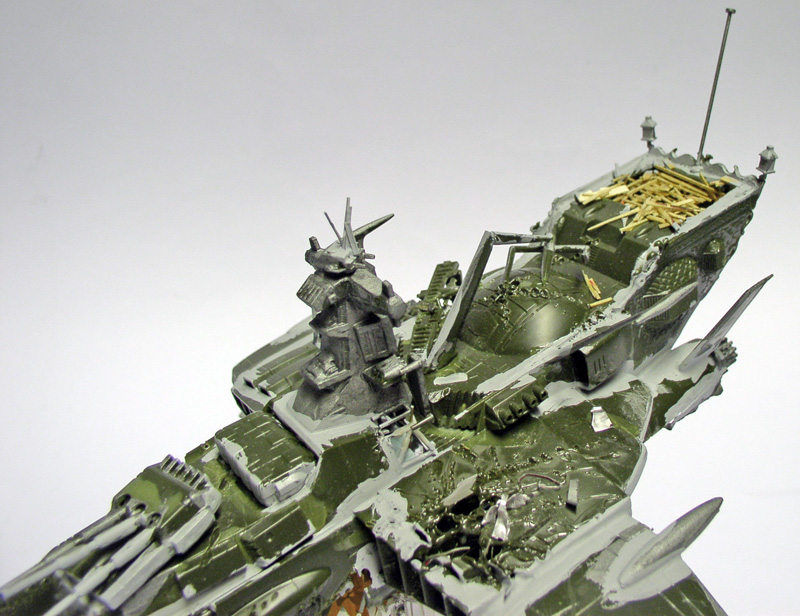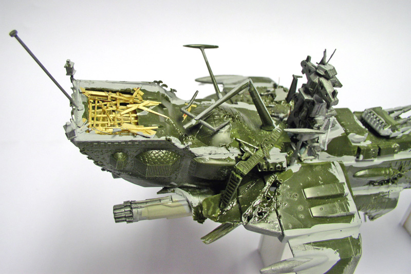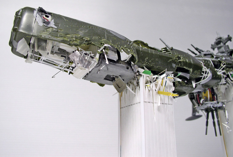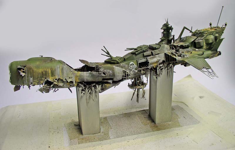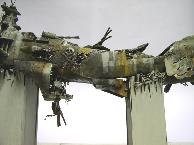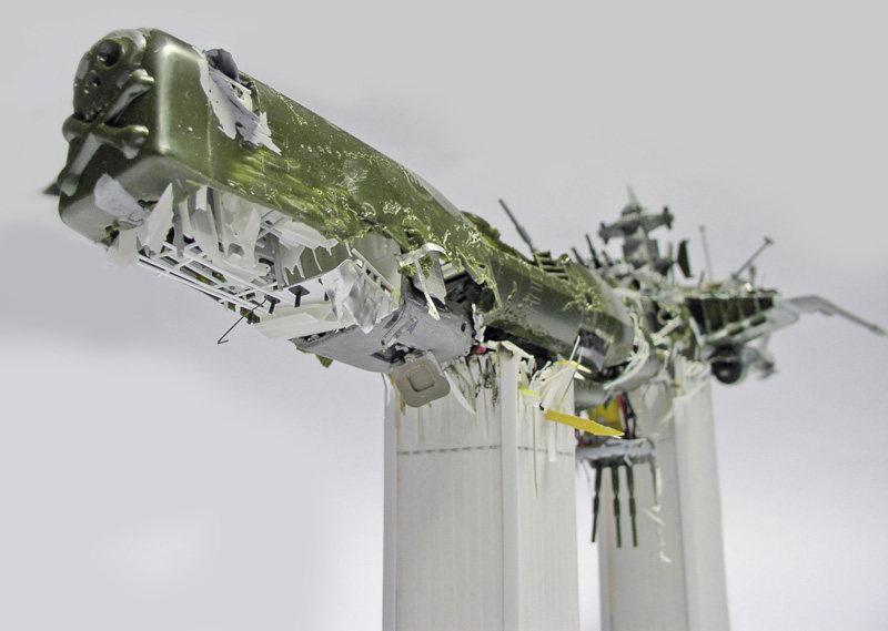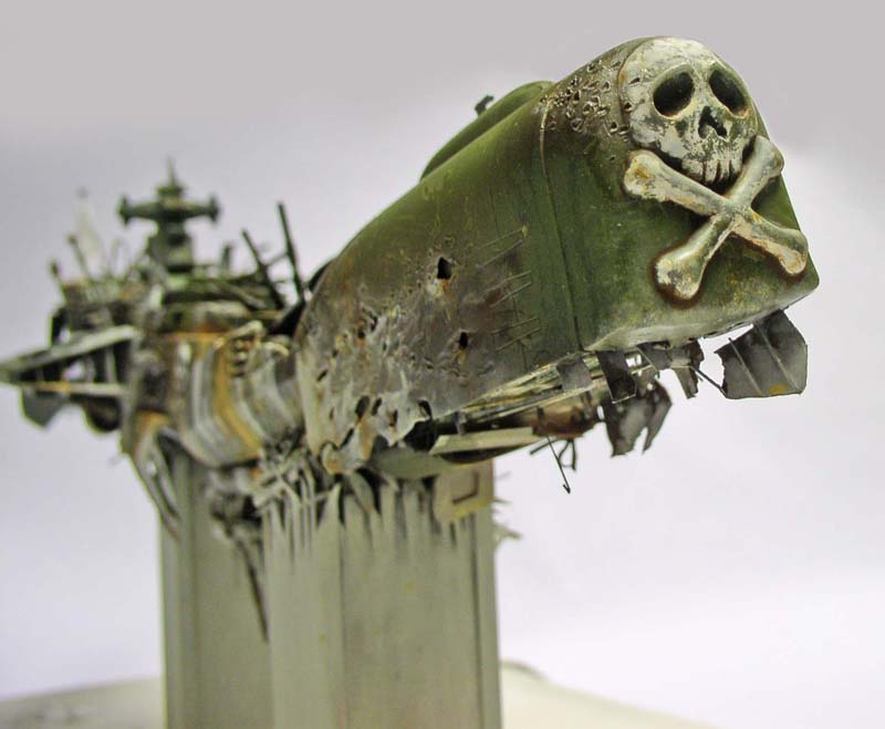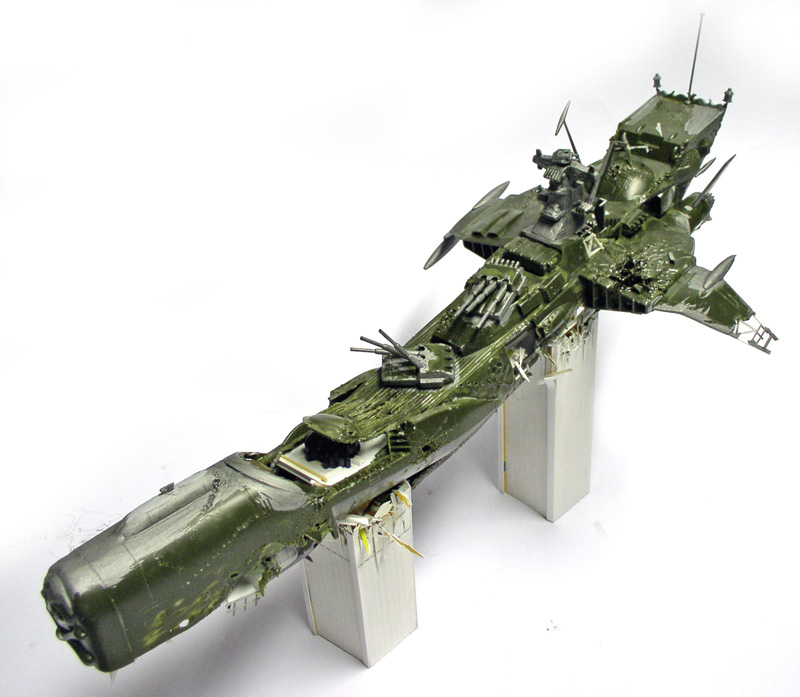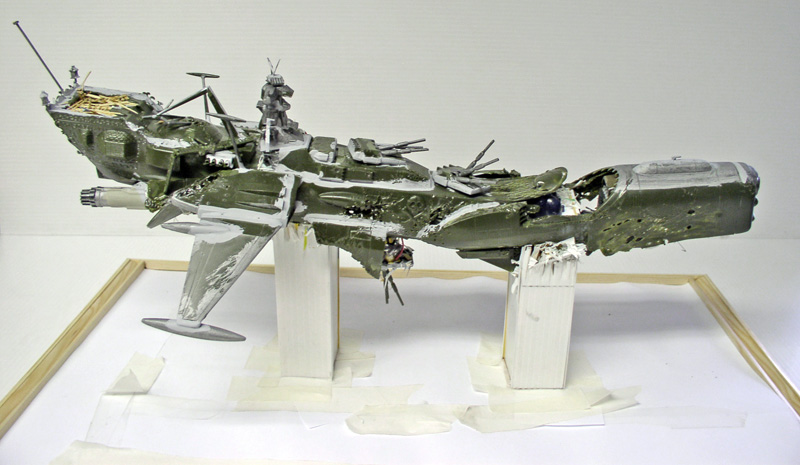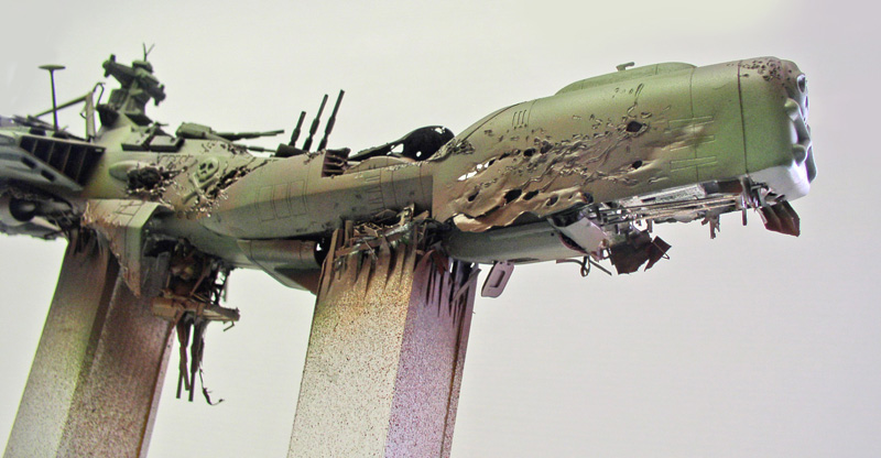 View of the positioned model... The impacts of laser fire and various explosions on the hull are made with a pyrograver (they are best seen in the photos showing the painting stages...