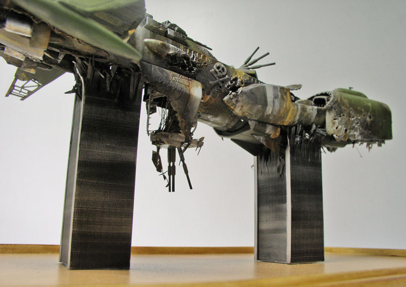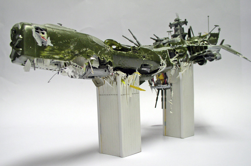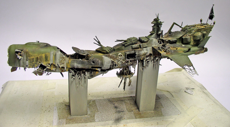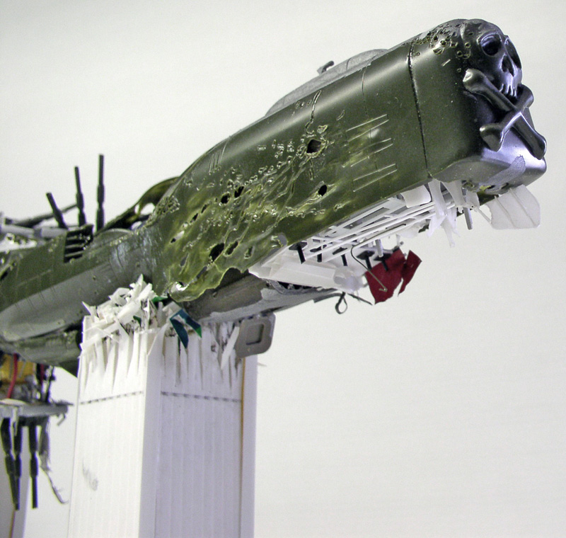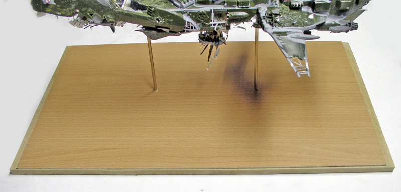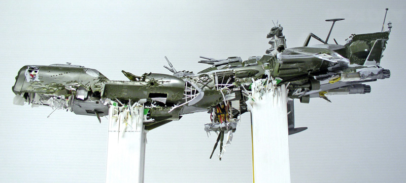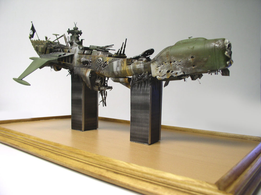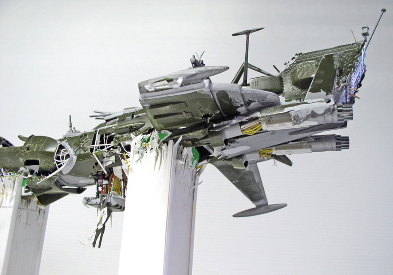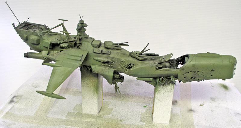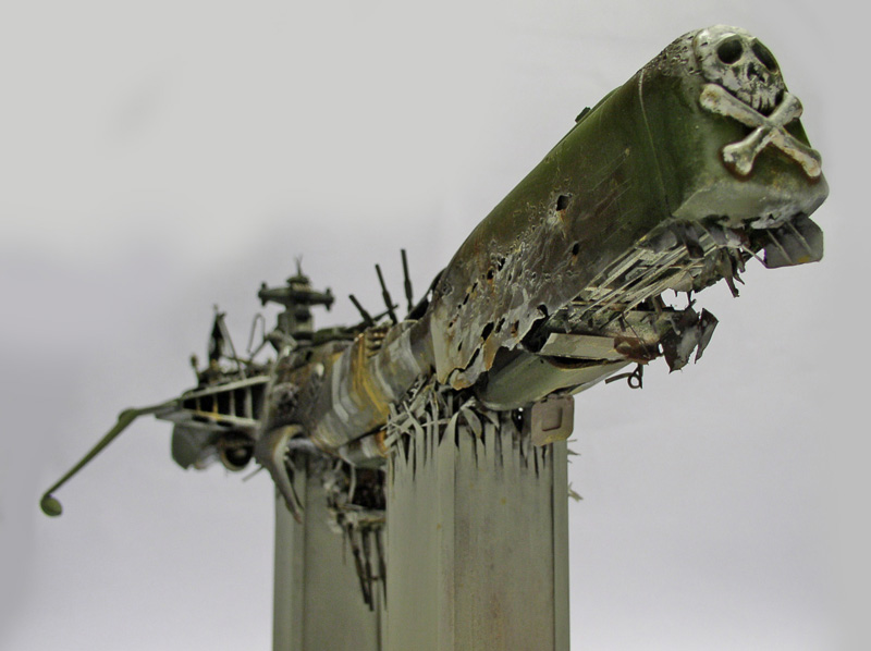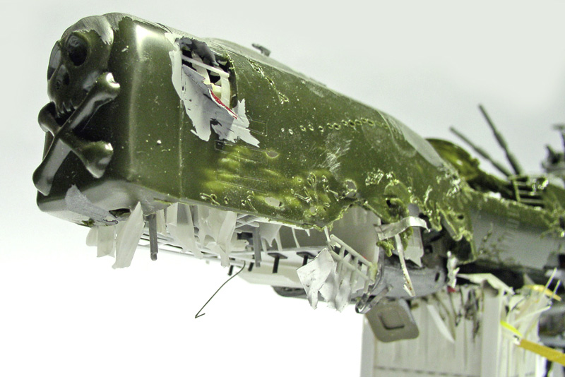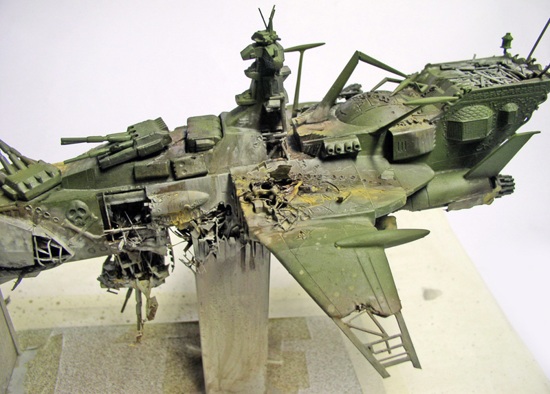 View of the positioned model... The impacts of laser fire and various explosions on the hull are made with a pyrograver (they are best seen in the photos showing the painting stages...