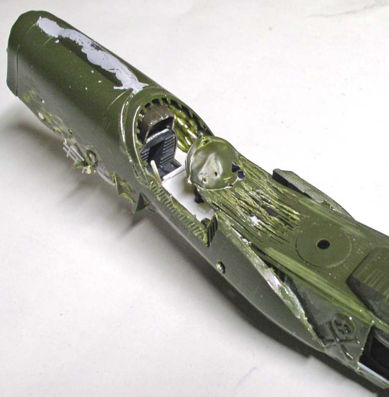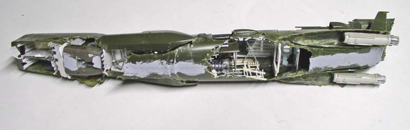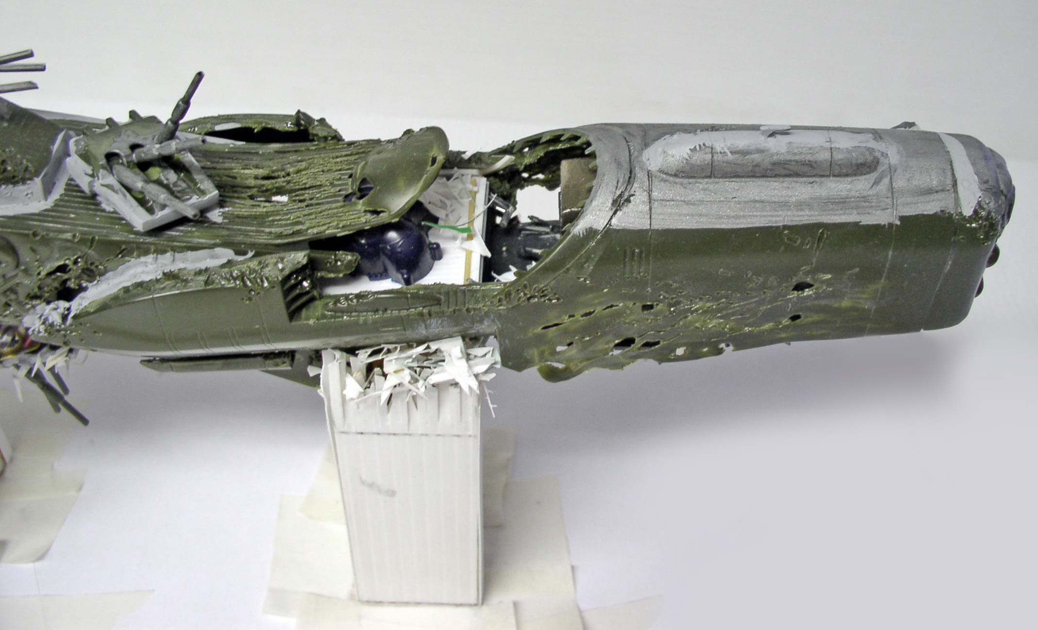The next step is to airbrush the damaged areas and darken the interior. Humbrol black and Testors Model Master leather and rust base. Always start spraying from darker to lighter shades...