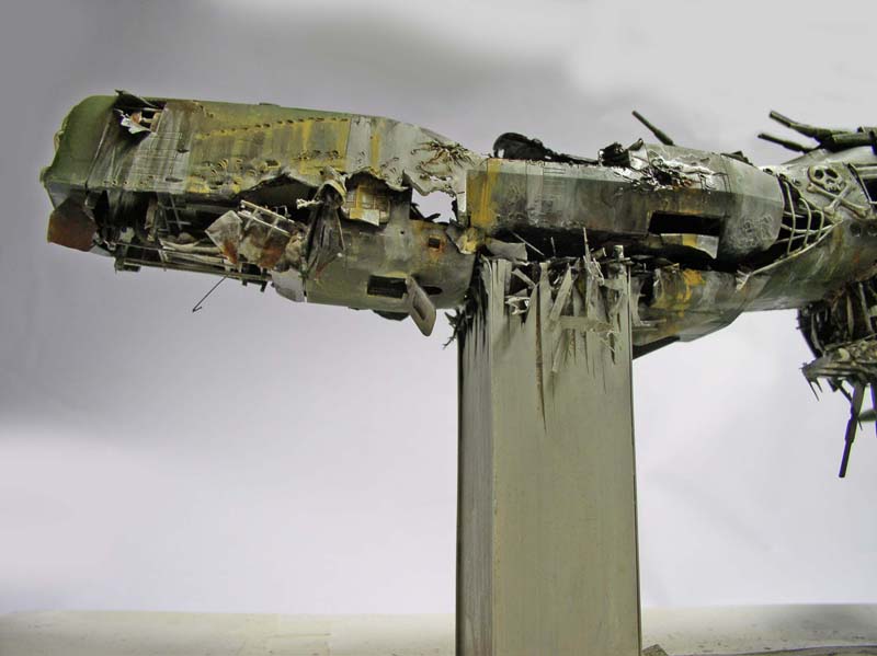 The towers are airbrushed with black chrome trim and Testors Model Master silver. Photo-etched stencils are used to simulate the bay windows (remember, we're talking 1/1000 scale). The diorama shows only the TOP of the towers, so no debris on the ground...