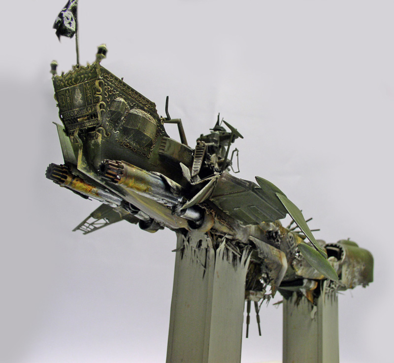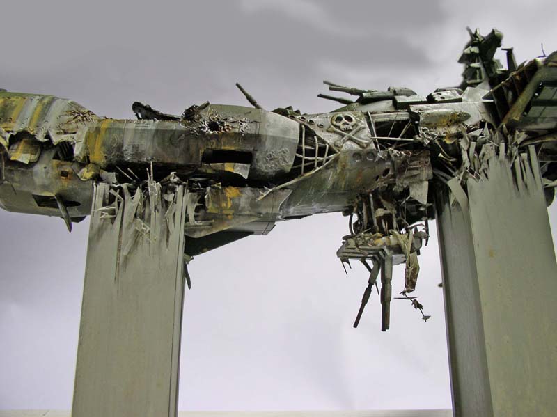 Once that's done, we can continue to detail the destruction of the towers, adding a number of beams and various deformed parts, and linking up with the spaceship...