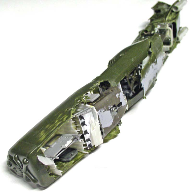 L'étape suivante consiste à peindre à l'aérographe les parties endommagées et assombrir l'intérieur. Base de noir Humbrol et cuir et rouille Testors Model Master. Toujours commencer la projection par les teintes foncées vers les claires...