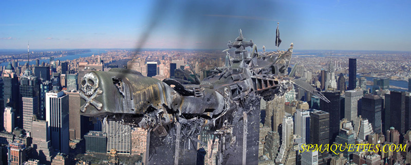 Les tours sont peintes à l'aérographe à base de black chrome trim et argent Testors Model Master. De la photodécoupe servira de pochoir pour simuler les baies vitrées (n'oublions pas que nous sommes au 1/1000ème). Le diorama représente seulement le HAUT des tours, donc, pas de débris au sol...