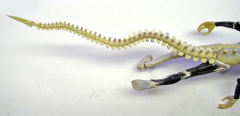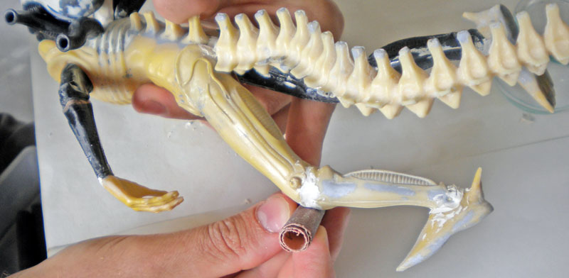 De nombreuses résines polyuréthane malgré le fait qu’elles ont été moulées et que la réaction chimique soit irréversible, conservent néanmoins une phase dite « thermoplastique ». Selon la résine et l’épaisseur, vous pourrez aisément les modifier en les chauffant et refroidissant brusquement (eau bouillant puis eau glacée). Remarquez ici la position que nous avons fait prendre à la queue grâce à ce procédé...