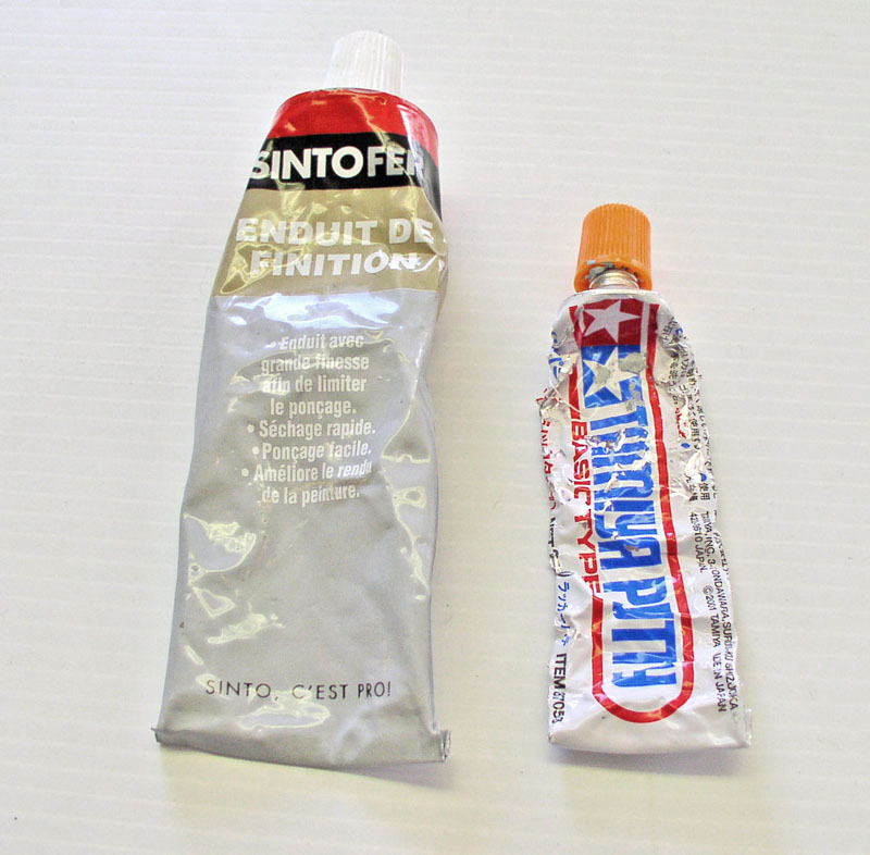 We then use Sintofer "finishing plaster" quality (single-component, grey), preferable to the tube of putty sold in model stores, which is much cheaper and of better quality...