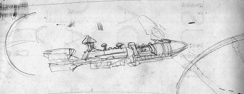 Un dessin préparatoire va servir de guide pour le futur décor avec une planète dans l'espace à gauche et le monde des extraterrestres à droite...