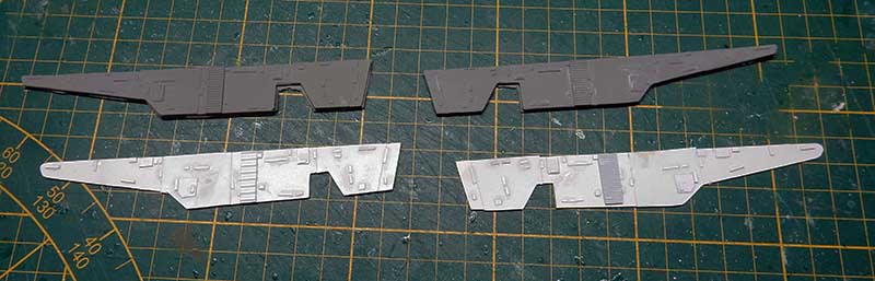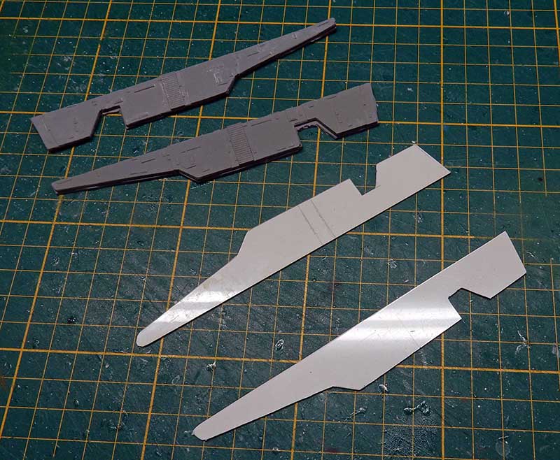 Les ailerons latéraux supérieurs - bien trop épais - seront refaits en carte plastique. Les originaux finiront au rebut...