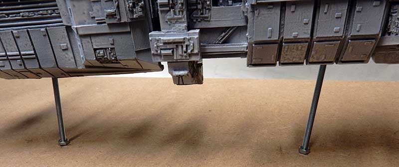 Avant peinture, on commence par fixer - après perçage du futur fond du décor - le corps du vaisseau à l'aide de tiges filetées, d'écrous et de rondelles...