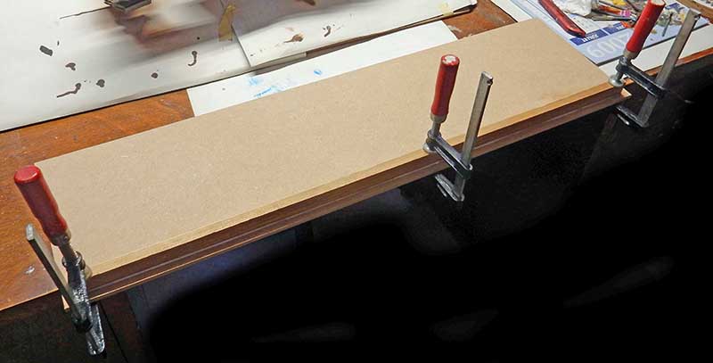 Le socle du décor. Un liteau carré est collé à la colle à bois. Le décor peint sera ensuite collé contre ce support...