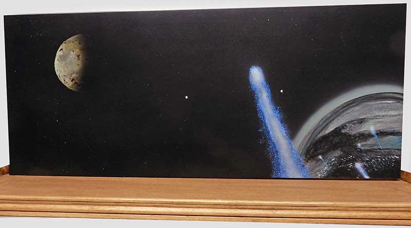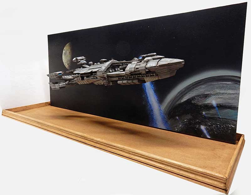 Collage du décor sur le socle. On aperçoit les trous qui serviront à fixer l'astronef...